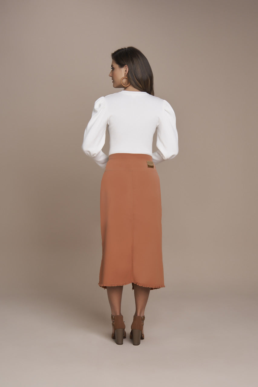 Uma saia de sarja evasê com 75 cm de comprimento, confeccionada em sarja de alta qualidade. Possui aviamento na cor dourada, fechamento frontal com botão, modelagem evasê, bolso frontal e traseiro funcional. O detalhe frontal com puído e desfiado na barra traz um toque moderno e estiloso. Com cintura alta e comprimento mídi, essa saia é perfeita para compor looks cheios de personalidade.
