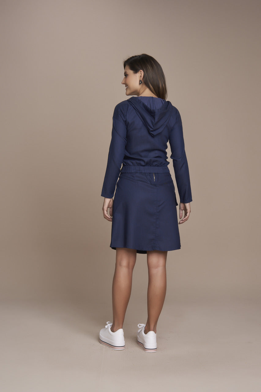 Jaqueta jeans com capuz, confeccionada em tecido que confere brilho natural e excelente caimento. Possui manga longa e fechamento frontal em zíper de plástico. Faz parte da linha sport, com capuz, viés para amarração e detalhe de corrosão, garantindo um look moderno e despojado.