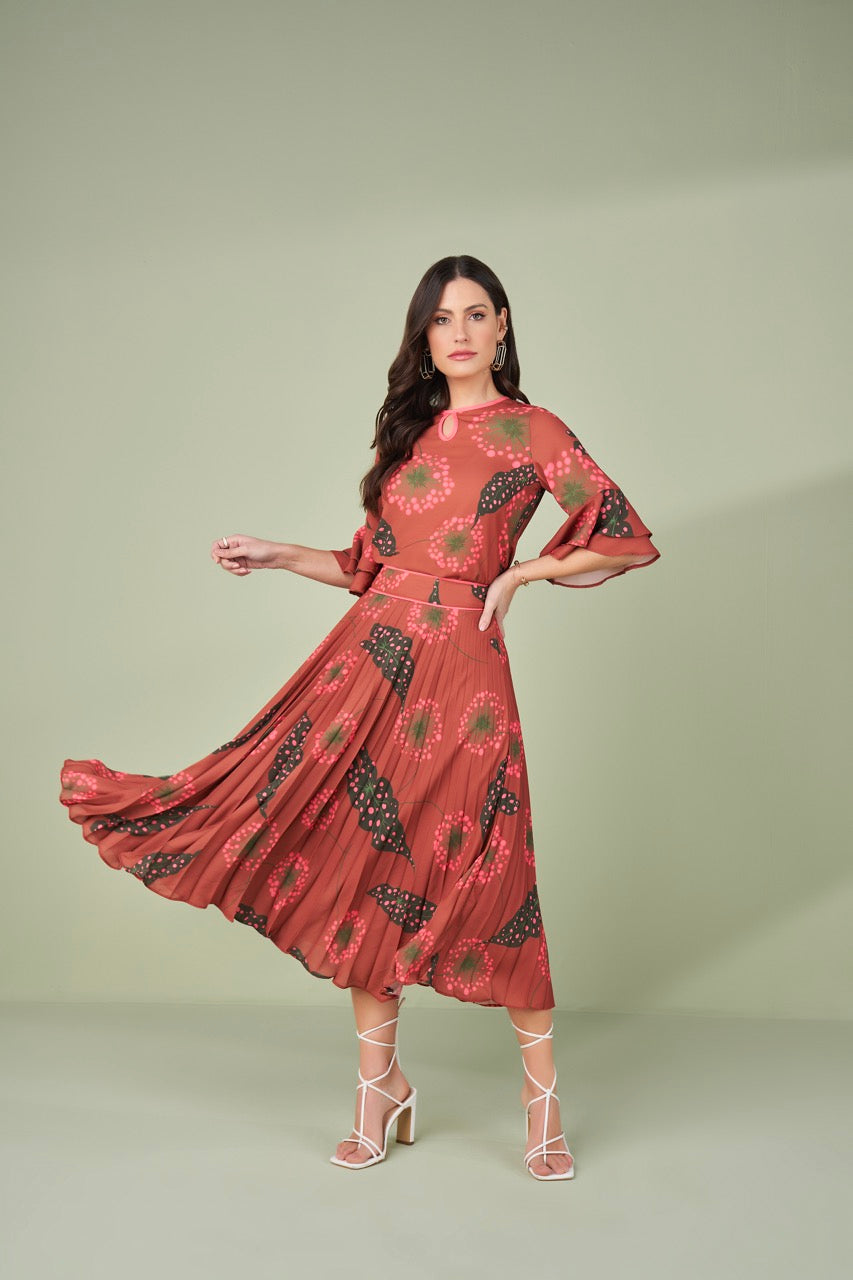 Blusa em crepe estampada, confeccionada em tecido plano de altíssima qualidade. Possui pesponto em linha cobre e aviamentos em banho dobra. Destaque para as mangas com babados e a gola em abertura em gota. O ponto alto da peça é a estampa exclusiva titanium, que garante um visual único e cheio de estilo.