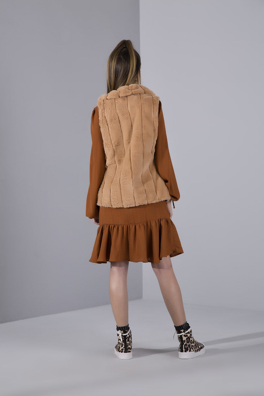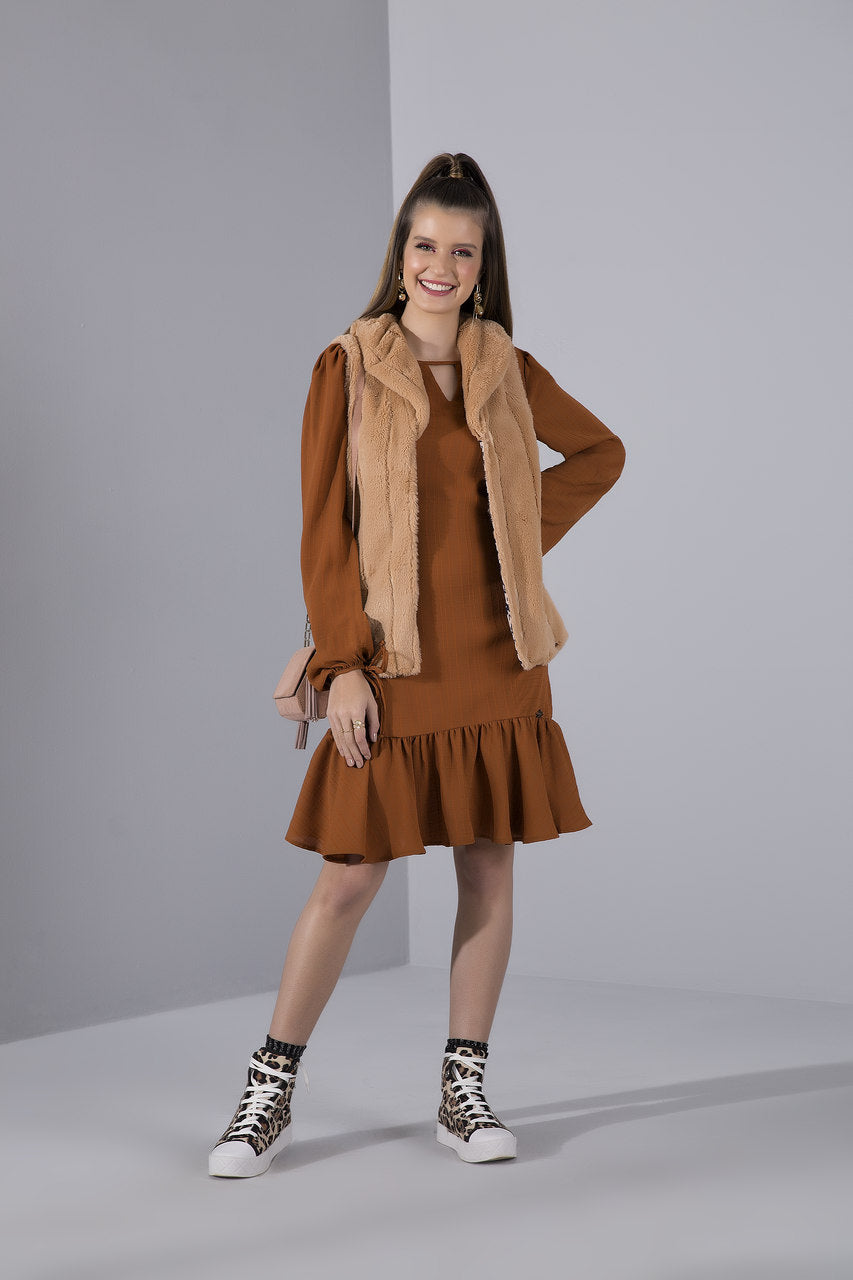 Colete Imperial Jeans de pelo dupla face, perfeito para quem busca versatilidade e estilo. Com um lado de pelo e outro em tecido plano estampado, esse colete permite diferentes combinações de looks. Aviamentos em cobre velho adicionam um toque especial à peça.