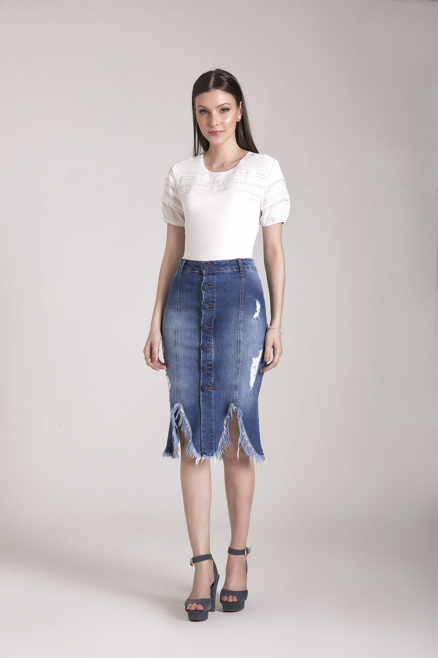 Peça tradicional e versátil, a Saia Jeans Laura Rosa possui um estilo atemporal e moderno. Com lavanderia sky bleach, puídos e recortes na barra, essa saia é perfeita para compor looks despojados e cheios de personalidade. Seu fechamento frontal com botões encapados e bolsos traseiros funcionais garantem um toque de charme extra. Além disso, a modelagem tradicional proporciona um caimento impecável, tornando-a uma peça indispensável no guarda-roupa feminino.