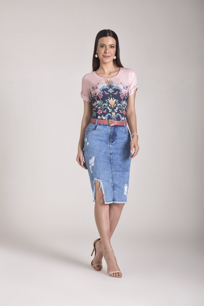 Peça tradicional e versátil, a Saia Jeans Laura Rosa possui 62cm de comprimento. Feita em jeans de alta qualidade, com lavanderia sky bleach e puídos, essa saia é ideal para compor looks despojados e cheios de estilo. Possui bolsos frontais e traseiros funcionais, fechamento em zíper e botão, além de detalhe de abertura frontal. Parte da linha sustentável, foi produzida com técnicas que reduzem significativamente o uso de água em seu processo de criação.