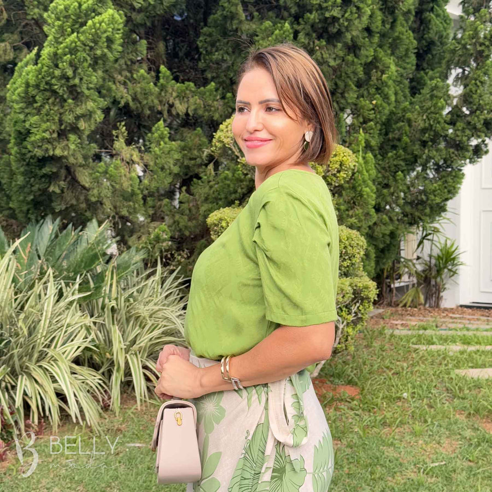 Confeccionada em tecido plano jacar texturizado com toque de algodão, a Blusa Angelina Meia Manga da Belly Moda proporciona conforto e estilo. Com gola redonda média com detalhes vazados e botão decorativo frontal, sua manga 3/4 possui um drapeado que adiciona um toque diferenciado à peça. Versátil e elegante, essa blusa é perfeita para compor diversos looks e arrasar no visual.