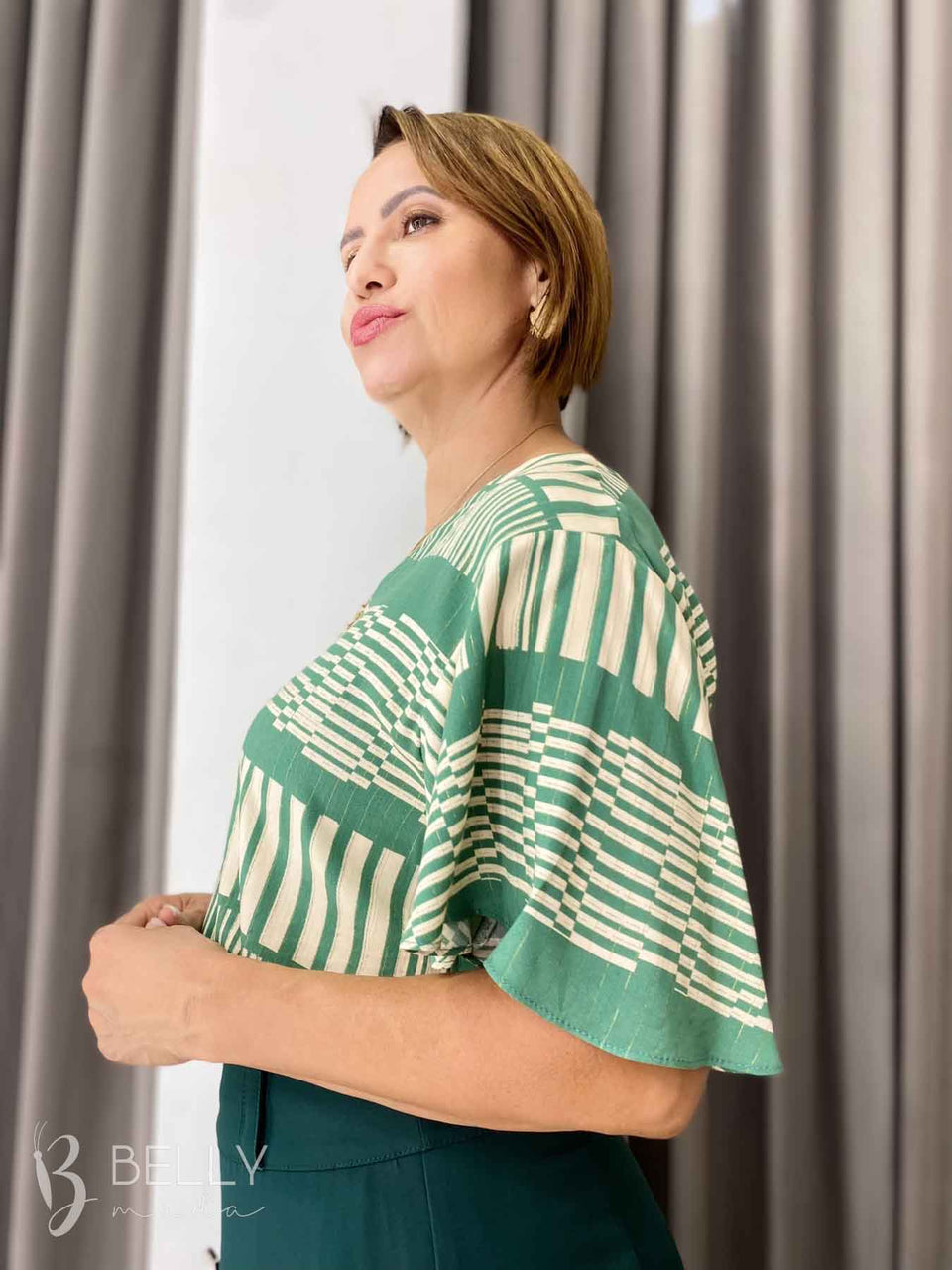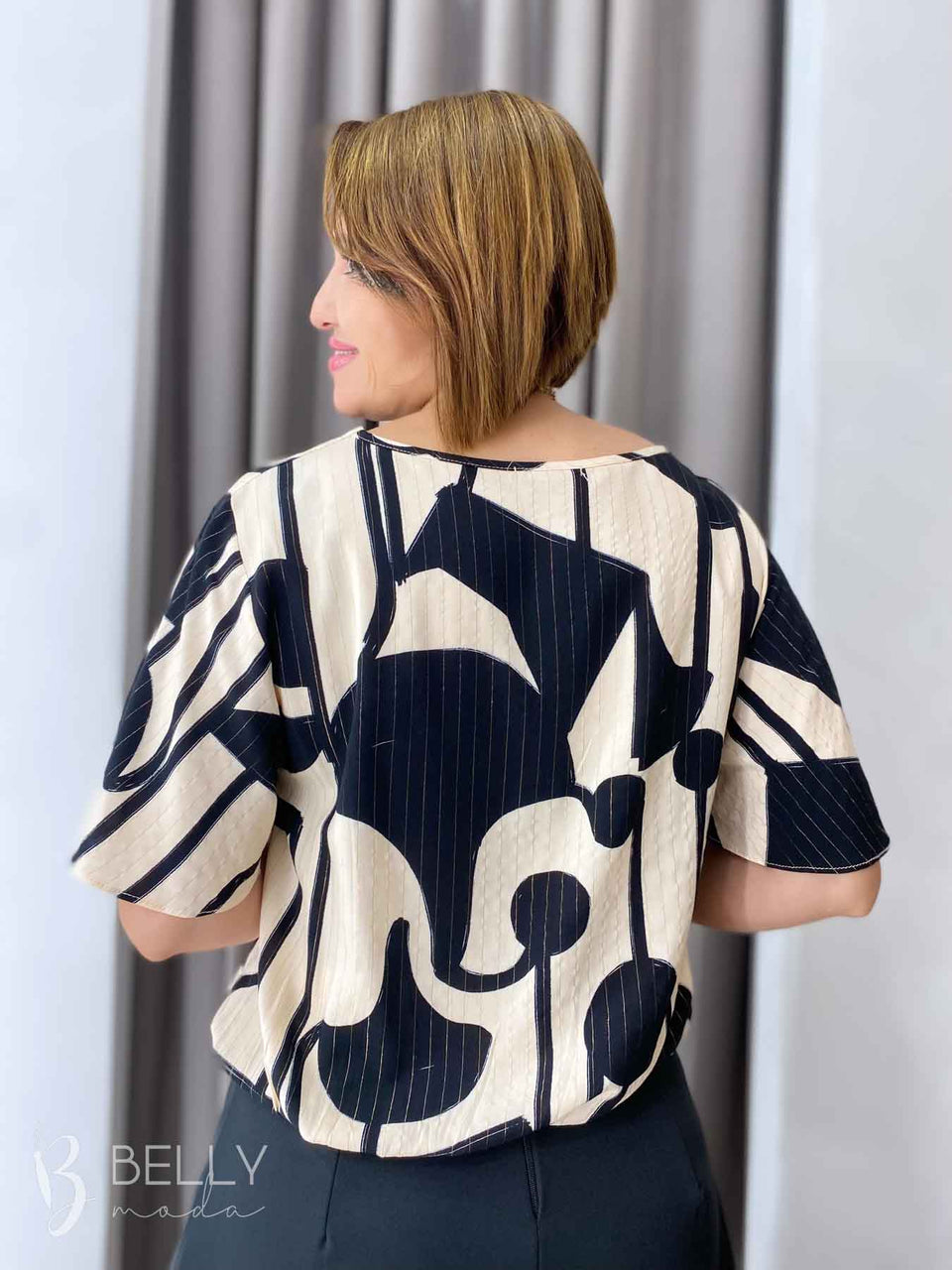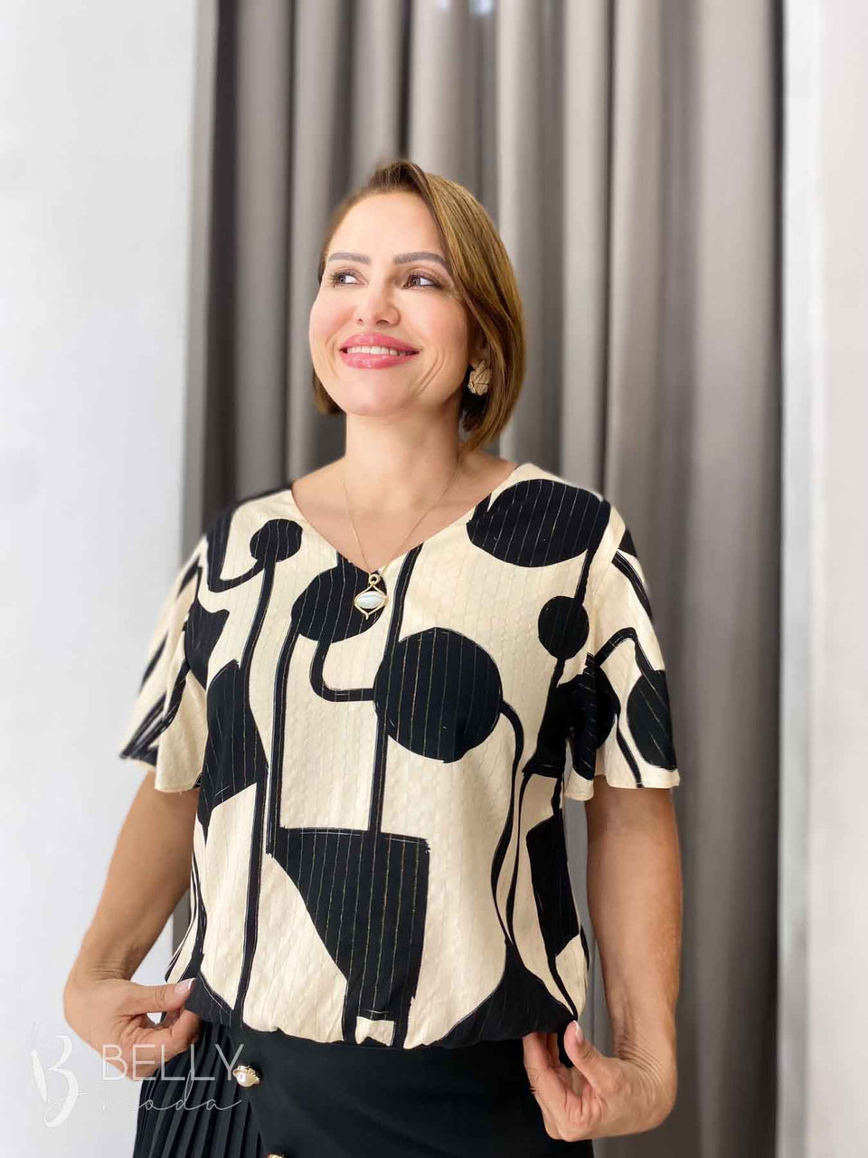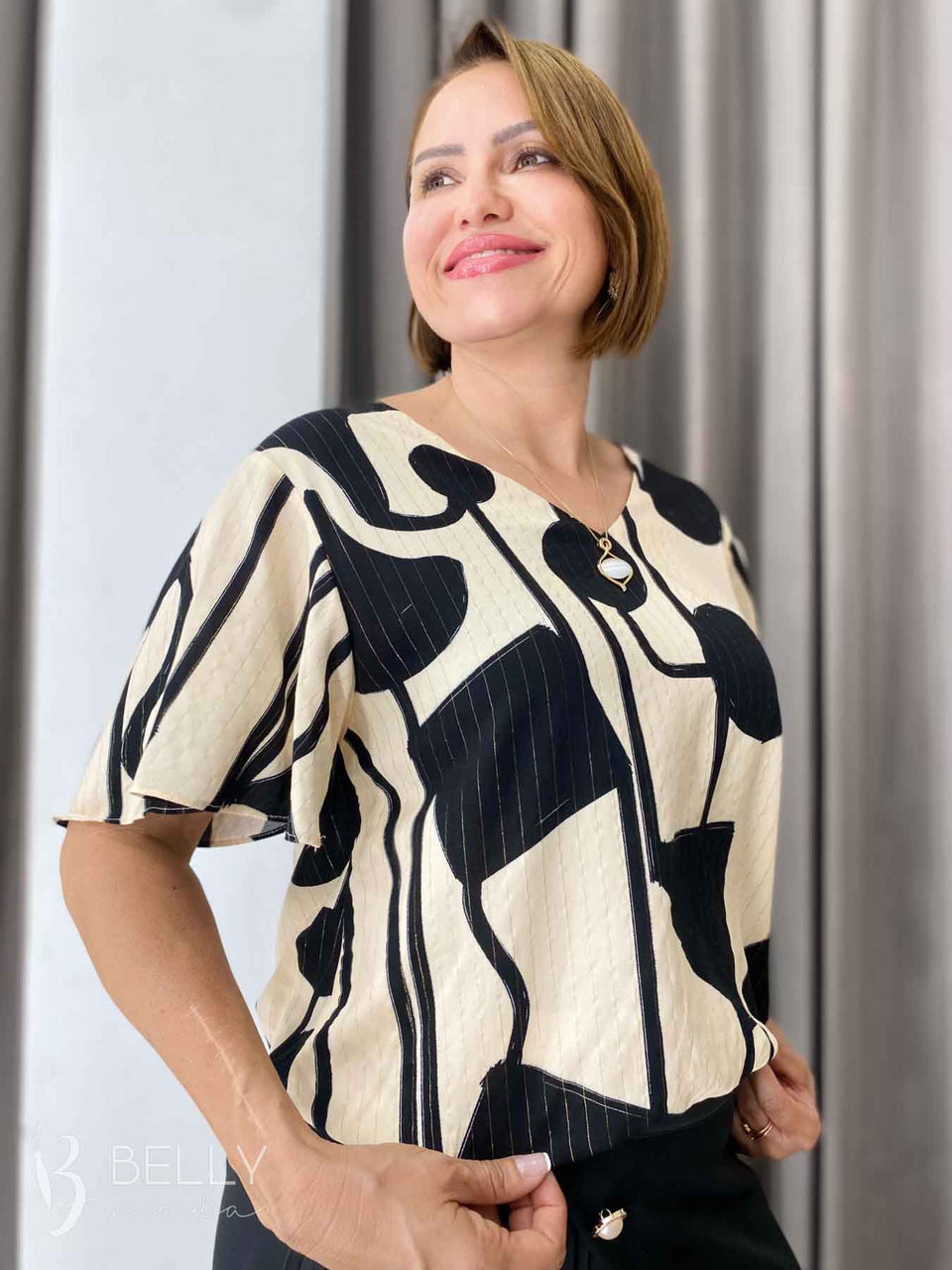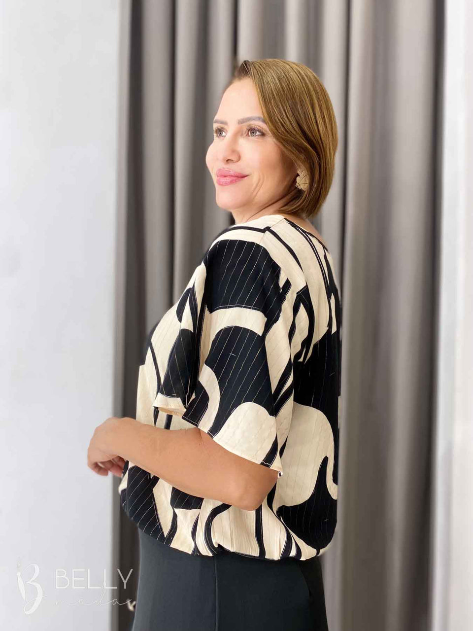 Blusa elegante e sofisticada da marca Belly Moda, confeccionada em viscose com fios de lurex, proporcionando um toque macio e suave. Possui manga 3/4 ampla, decote em "V" e modelagem confortável, ideal para compor looks versáteis e cheios de estilo.