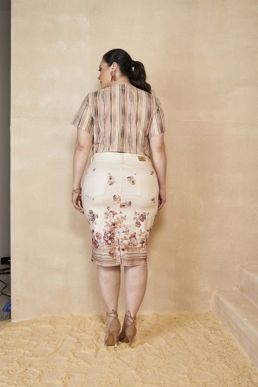 Blusa estampada plus size confeccionada em tecido plano de alta qualidade com elastano. Possui estampa exclusiva Titanium Jeans, fechamento frontal com botões dourados e detalhe de amarração na frente, garantindo um visual moderno.