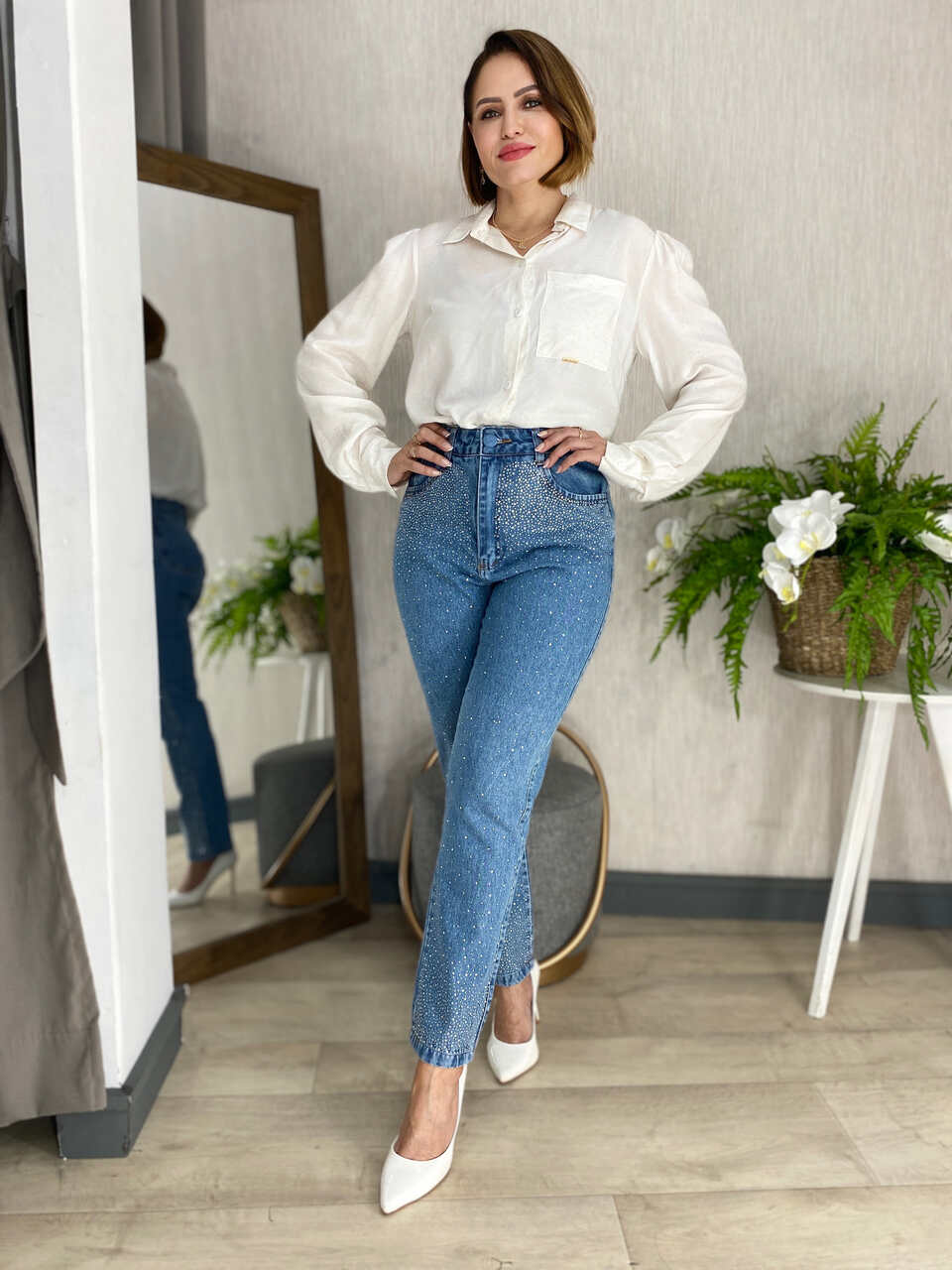 Com um estilo moderno e versátil, a CALÇA JEANS MOM COM ALTO COLANTES da BELLY MODA é confeccionada em jeans com brilho na parte frontal, em lavagem média. Possui modelagem mom, bolso frontal e posterior funcionais, passantes e fechamento em zíper e botão. Ideal para compor looks tanto no dia a dia quanto em eventos especiais.