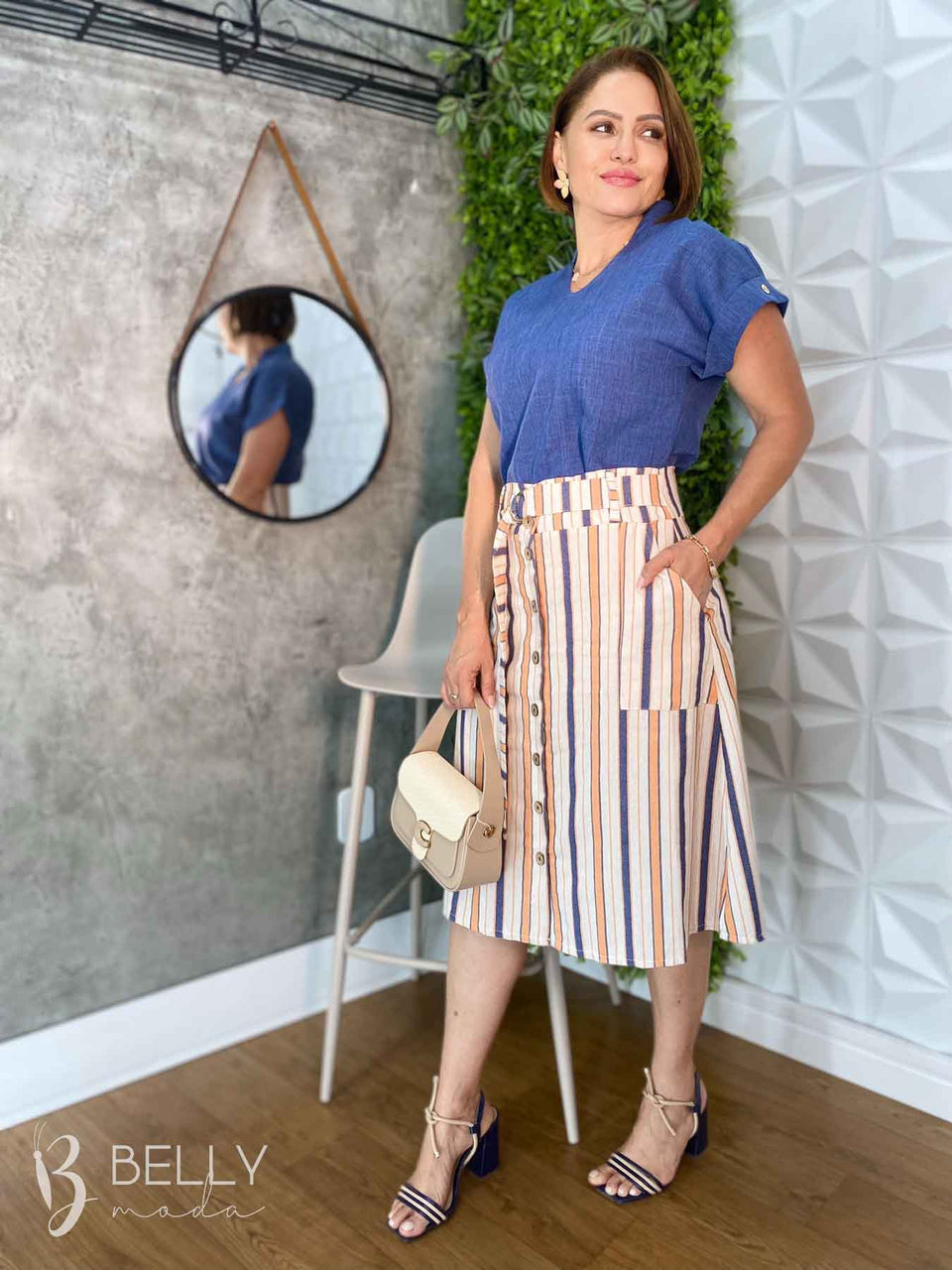 Conjunto Bárbara Evasê da Belly Moda com modelagem evasê, confeccionado em linho rústico. A blusa possui gola "V", manga raglã com um detalhe dobrado que adiciona elegância à peça, e uma manga que se ajusta a todos os padrões de braço. A saia conta com faixa embutida para marcar a cintura, possui bolso lateral e fechamento em botões frontais funcionais. O comprimento é abaixo do joelho.