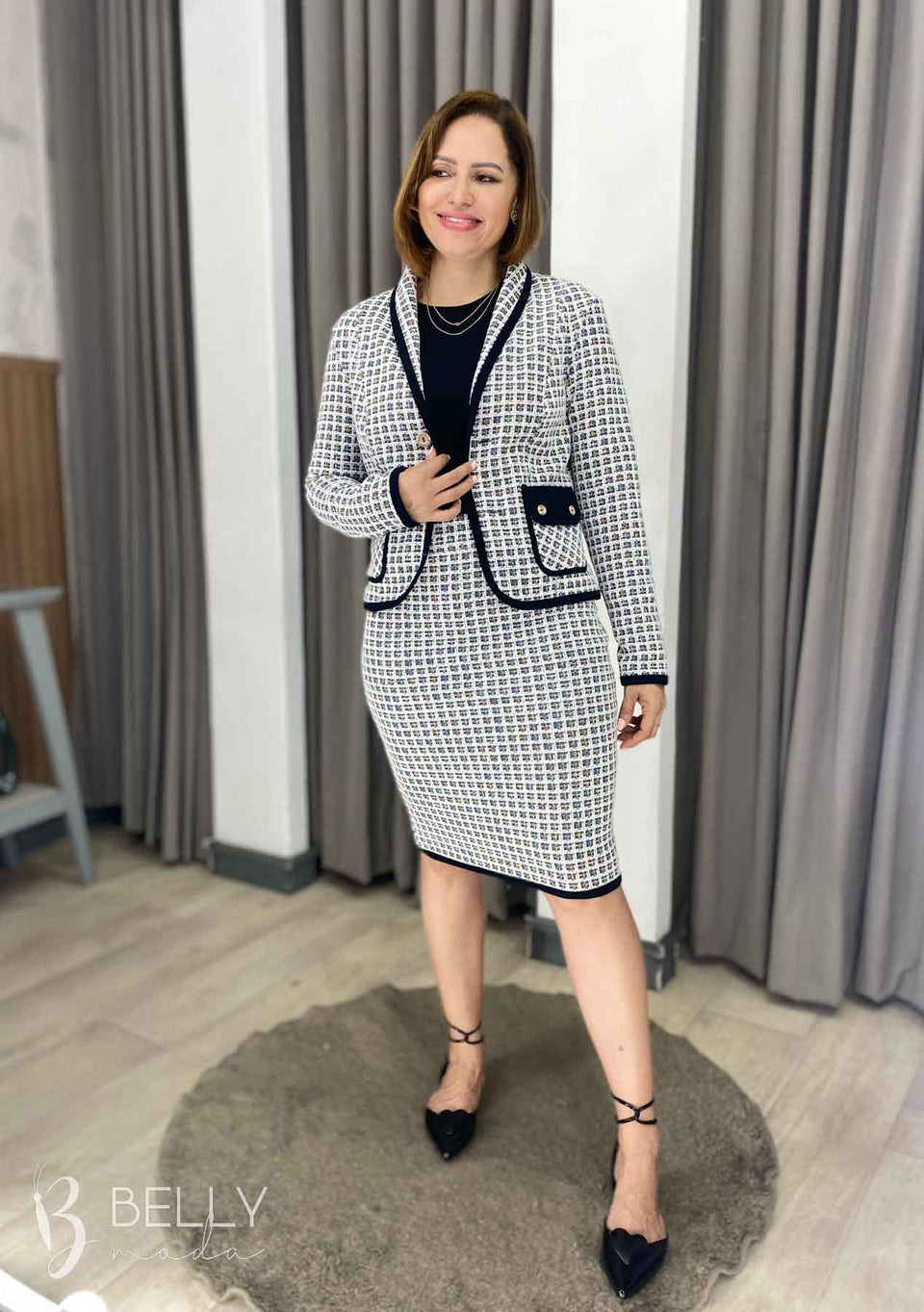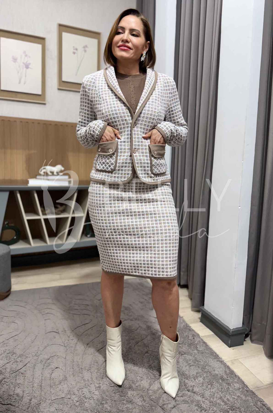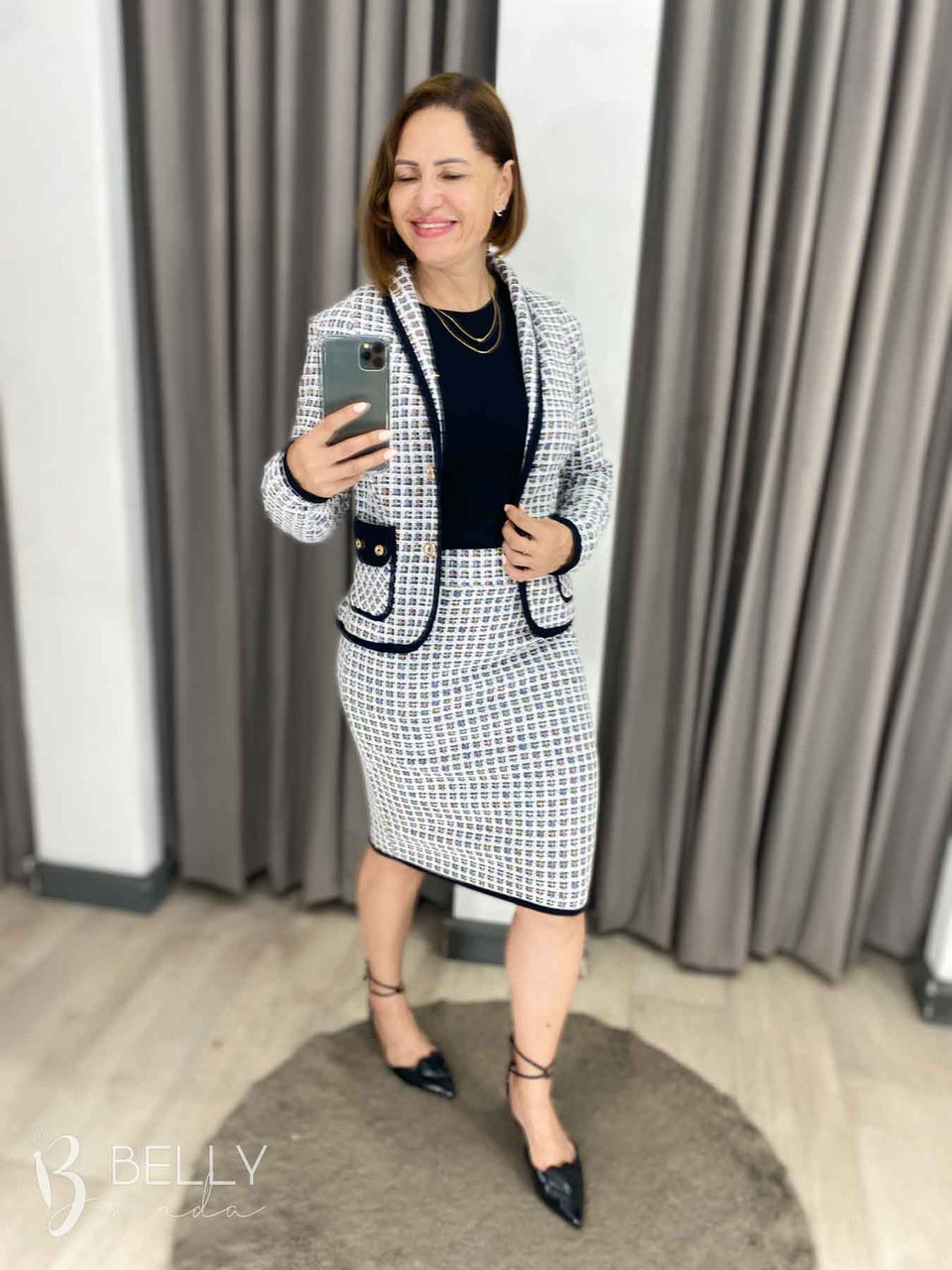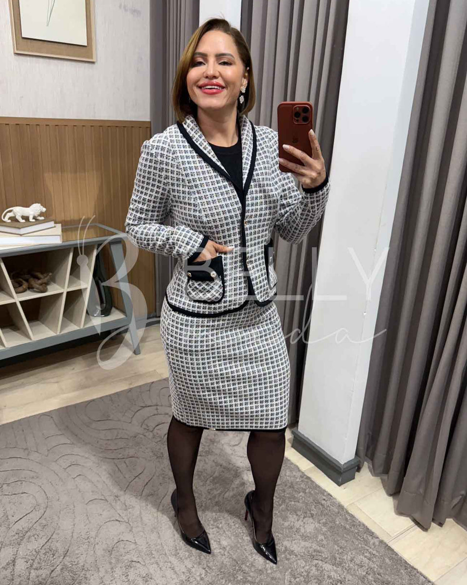 Conjunto Bianca Tweed é um conjunto elegante e sofisticado, perfeito para diversas ocasiões. A saia ajustada em malha tweed combina perfeitamente com o blazer de manga longa, com acabamentos em viés e fechamento em botões frontais. A saia possui bolsos faca funcionais e comprimento na altura do joelho, com cós largo e elástico para maior conforto.