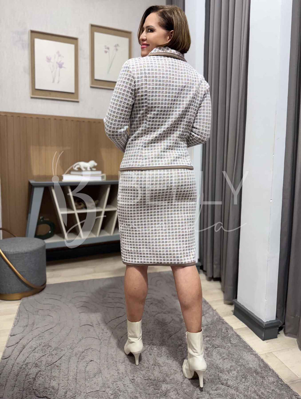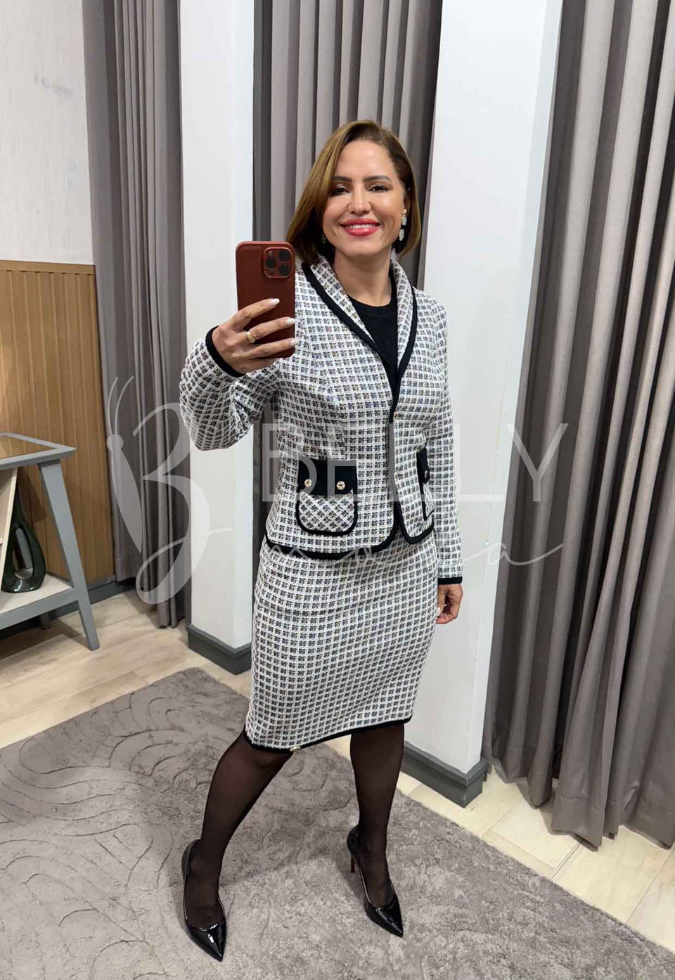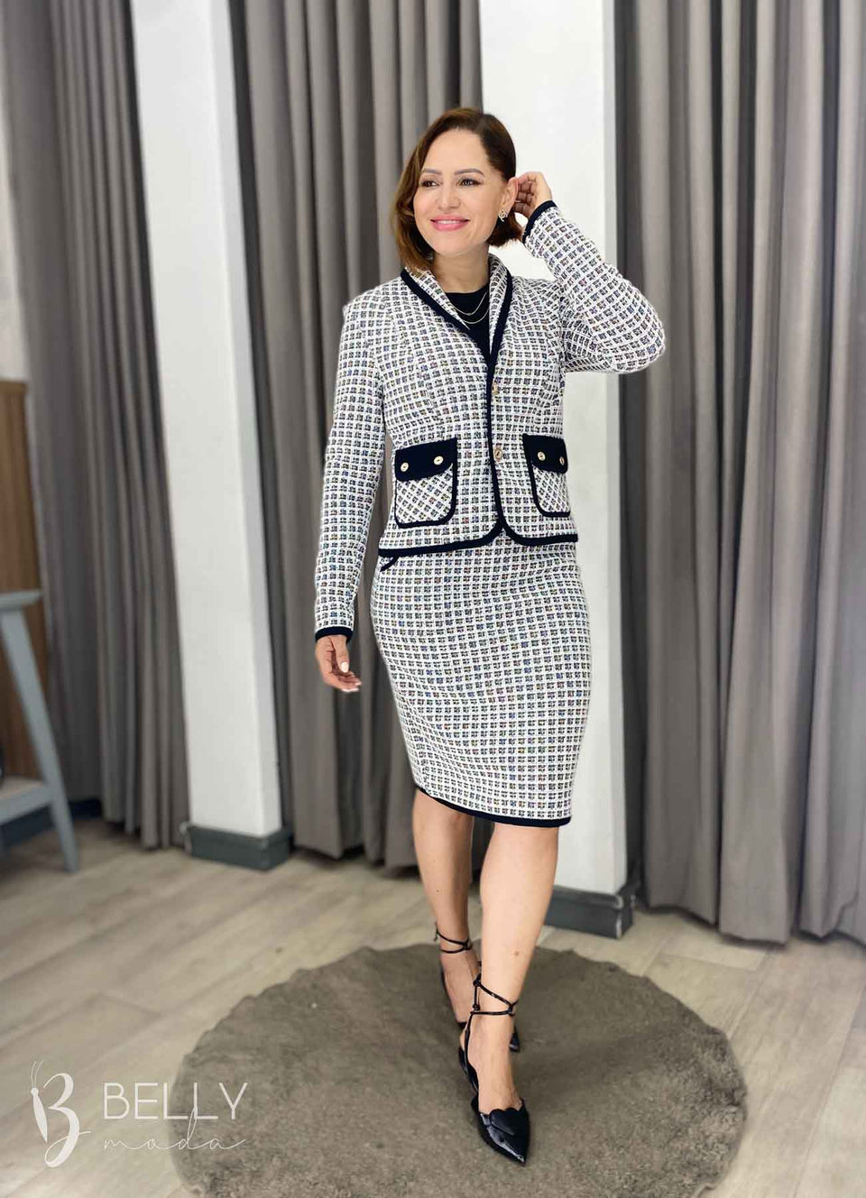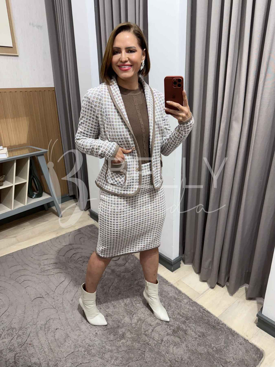 Conjunto Bianca Tweed é um conjunto elegante e sofisticado, perfeito para diversas ocasiões. A saia ajustada em malha tweed combina perfeitamente com o blazer de manga longa, com acabamentos em viés e fechamento em botões frontais. A saia possui bolsos faca funcionais e comprimento na altura do joelho, com cós largo e elástico para maior conforto.
