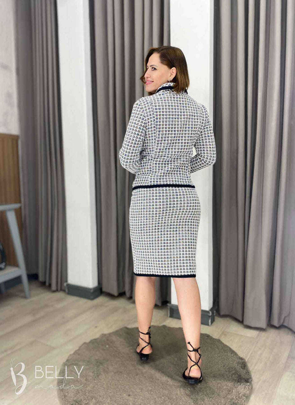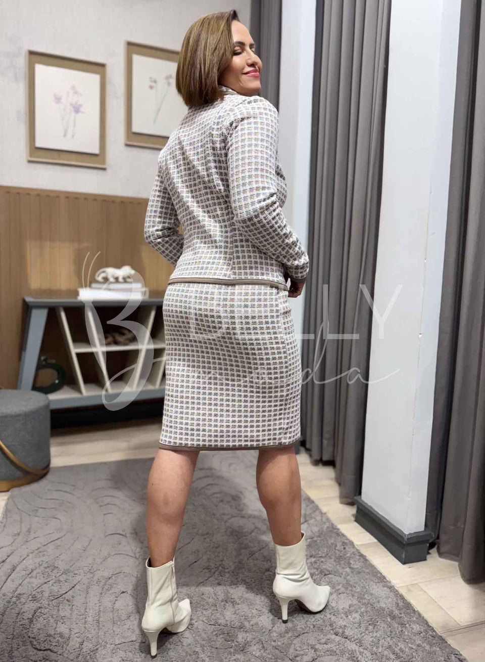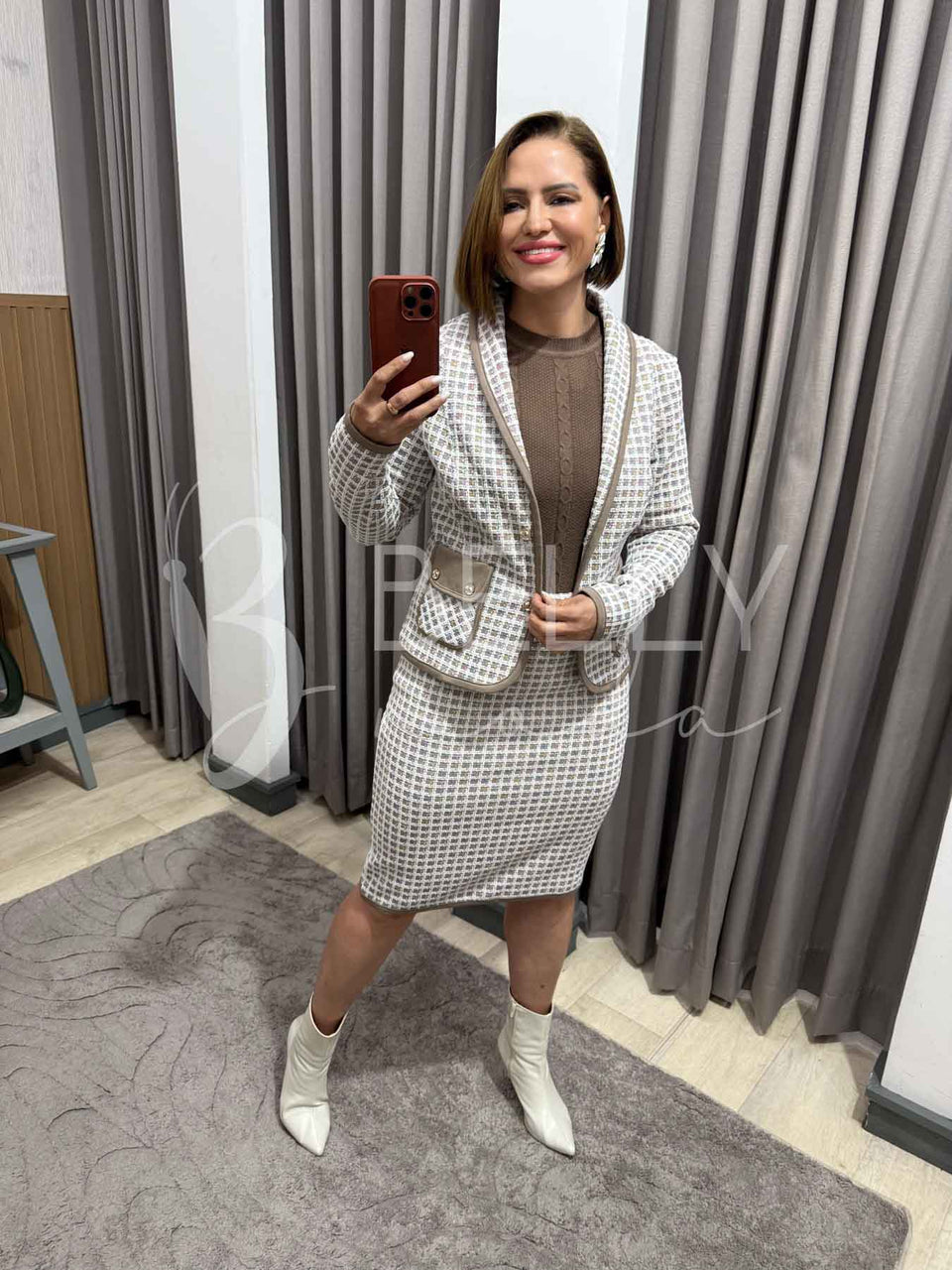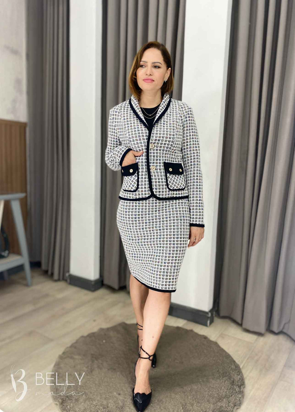 Conjunto Bianca Tweed é um conjunto elegante e sofisticado, perfeito para diversas ocasiões. A saia ajustada em malha tweed combina perfeitamente com o blazer de manga longa, com acabamentos em viés e fechamento em botões frontais. A saia possui bolsos faca funcionais e comprimento na altura do joelho, com cós largo e elástico para maior conforto.