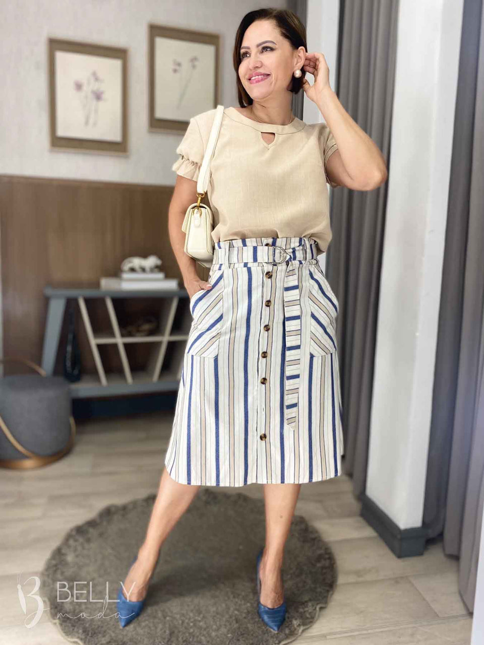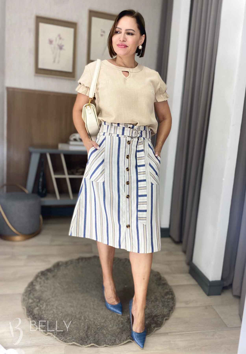 Destaque seu estilo com o Conjunto Brenda Midi da Belly Moda. Feito em linho, o conjunto é composto por uma blusa de manga curta com detalhe em lastex, gola redonda com um charmoso detalhe vazado, e uma saia evasê com bolsos laterais. O fechamento da saia é feito por botões frontais funcionais, e acompanha um cinto faixa fixo com fivela para regulagem. Seu comprimento midi, abaixo do joelho, confere elegância e versatilidade ao visual.