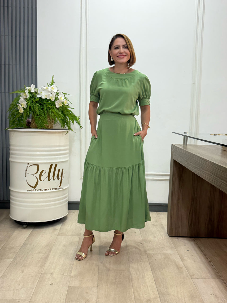 O Conjunto Denise é confeccionado em viscolinho de toque leve, trazendo elegância e conforto. A blusa apresenta decote canoa com drapeado e acabamento delicado em botões, enquanto a saia max midi possui marias e lastex na parte de trás, garantindo caimento impecável e visual sofisticado.