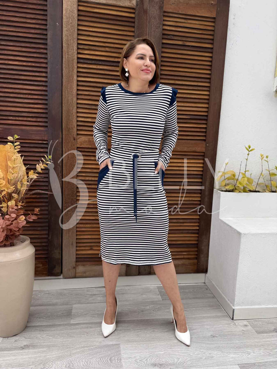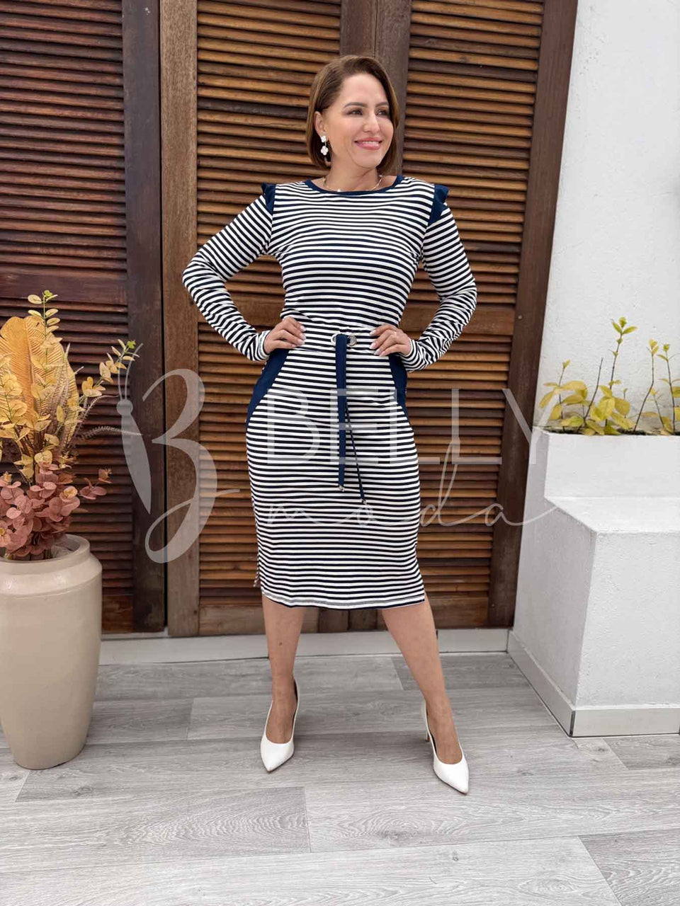 Um conjunto versátil e elegante, o Conjunto Jane Midi Listrado da Belly Moda é confeccionado em malha com excelente caimento. A blusa possui gola careca, manga longa e um delicado babadinho sobre os ombros, agregando charme e estrutura ao visual. A saia, em comprimento mídi, possui bolsos funcionais, fendas laterais sutis que proporcionam leveza ao caminhar e um detalhe de amarração com aviamentos, valorizando a silhueta e trazendo um toque moderno à peça.