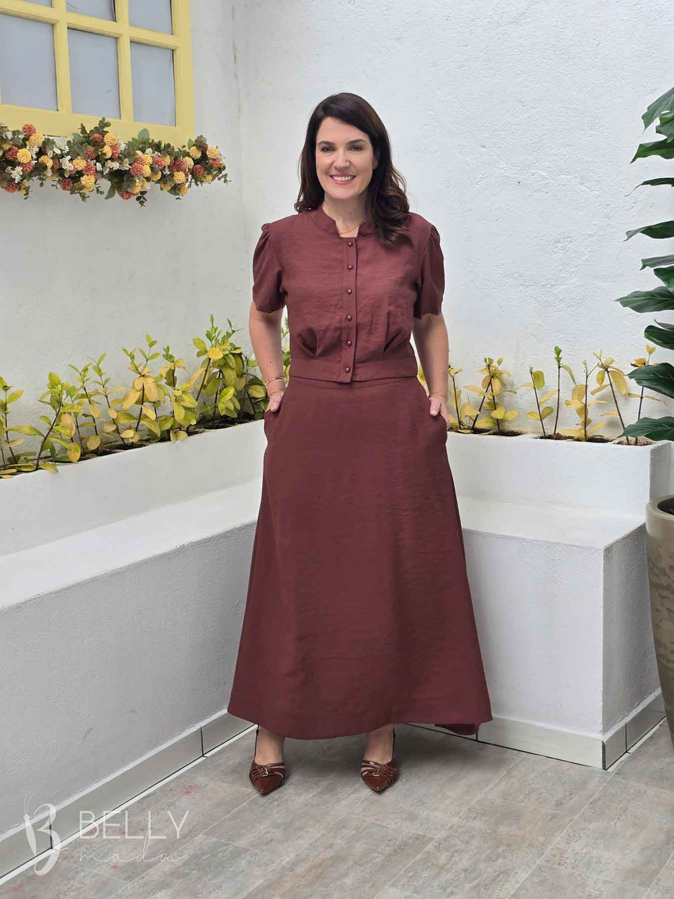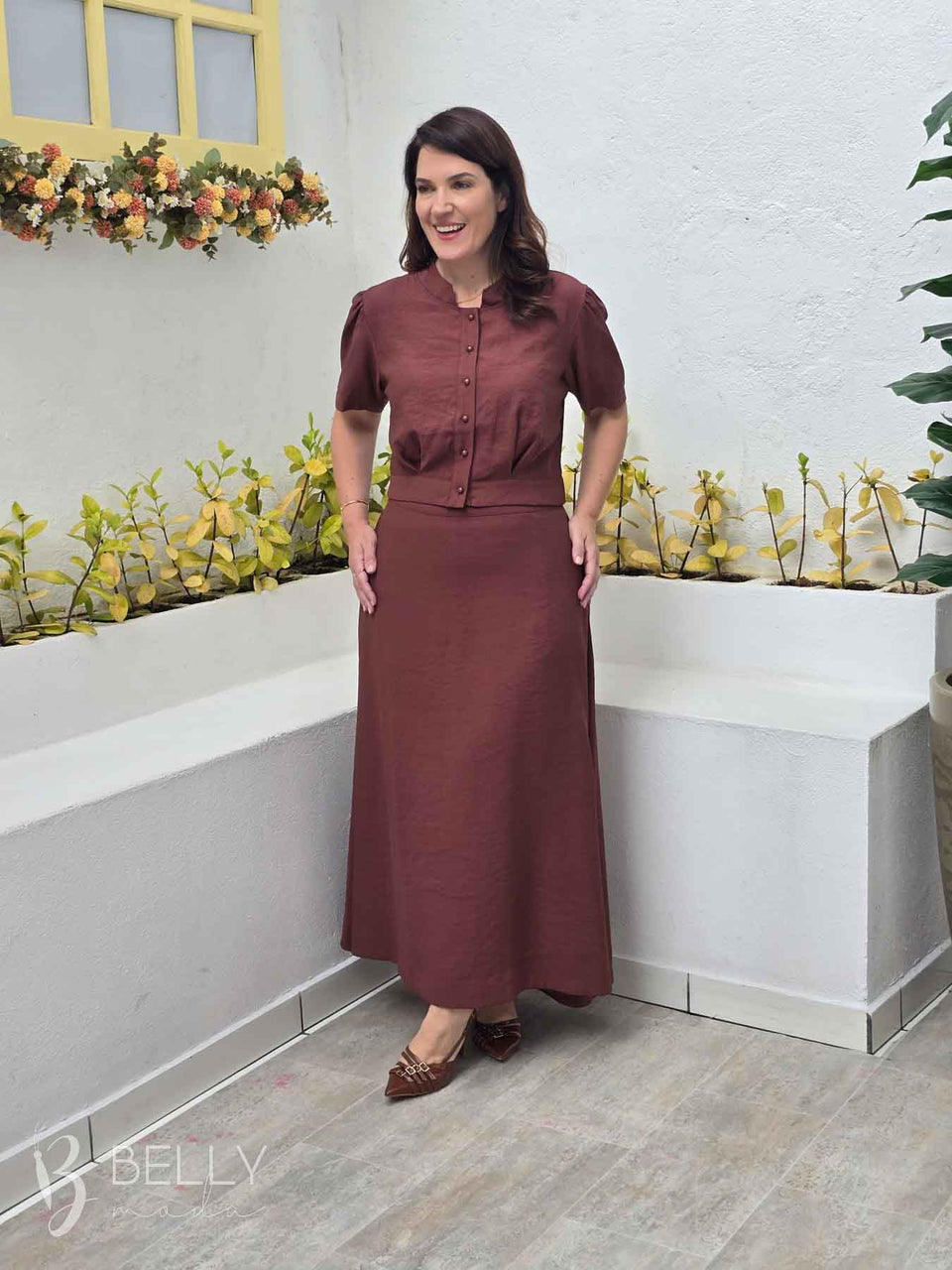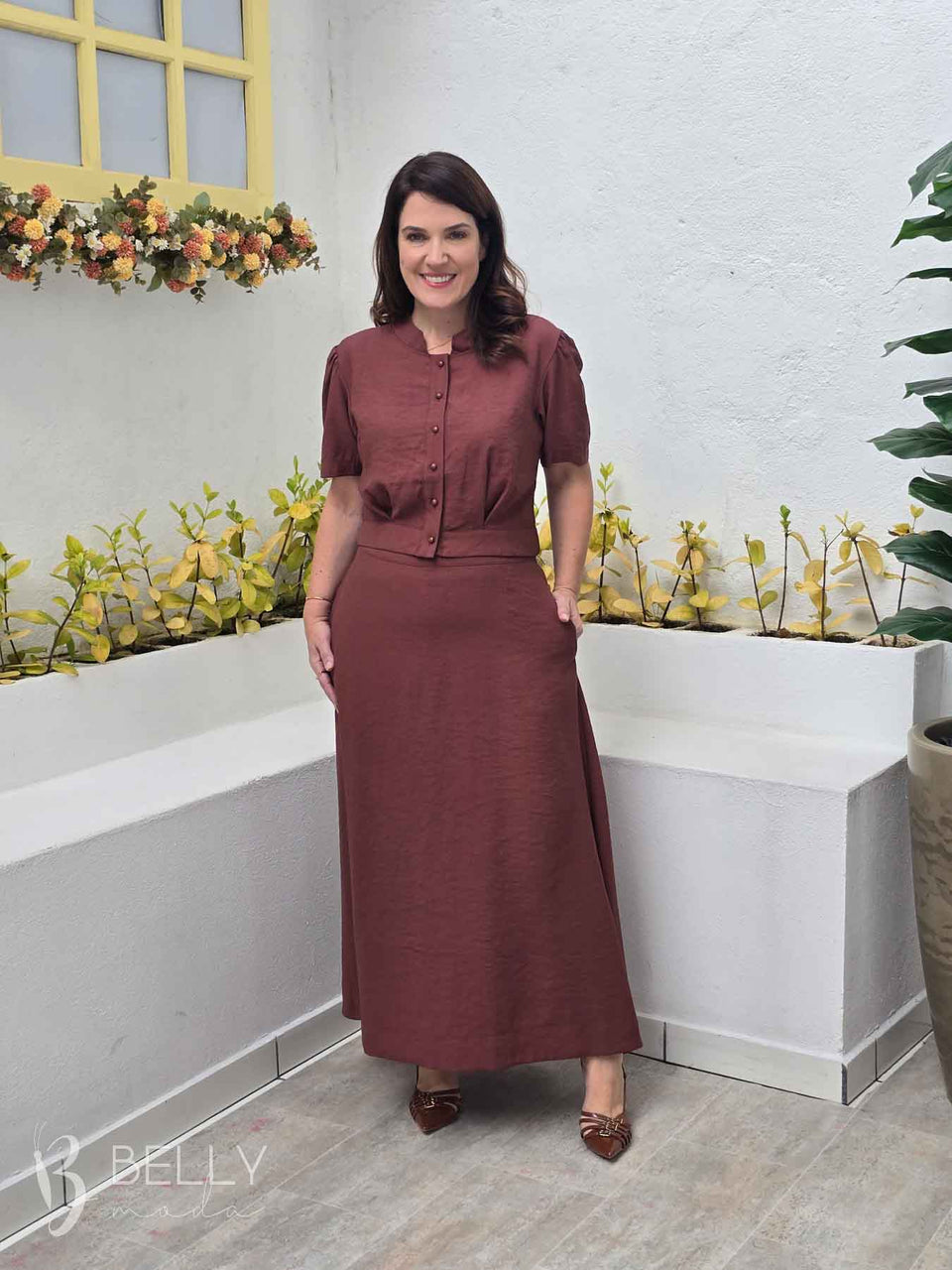 Conjunto Joana Max Midi da Belly Moda é uma opção elegante e versátil. Com modelagem evasê, o conjunto é confeccionado em tecido plano no corte alfaiataria. A blusa possui detalhe de franzido abaixo do busto, meia manga levemente bufante, gola mais fechada e fechamento em botões frontal. A saia também é evasê, com bolsos faca e fechamento em zíper na parte posterior, garantindo um comprimento max midi.
