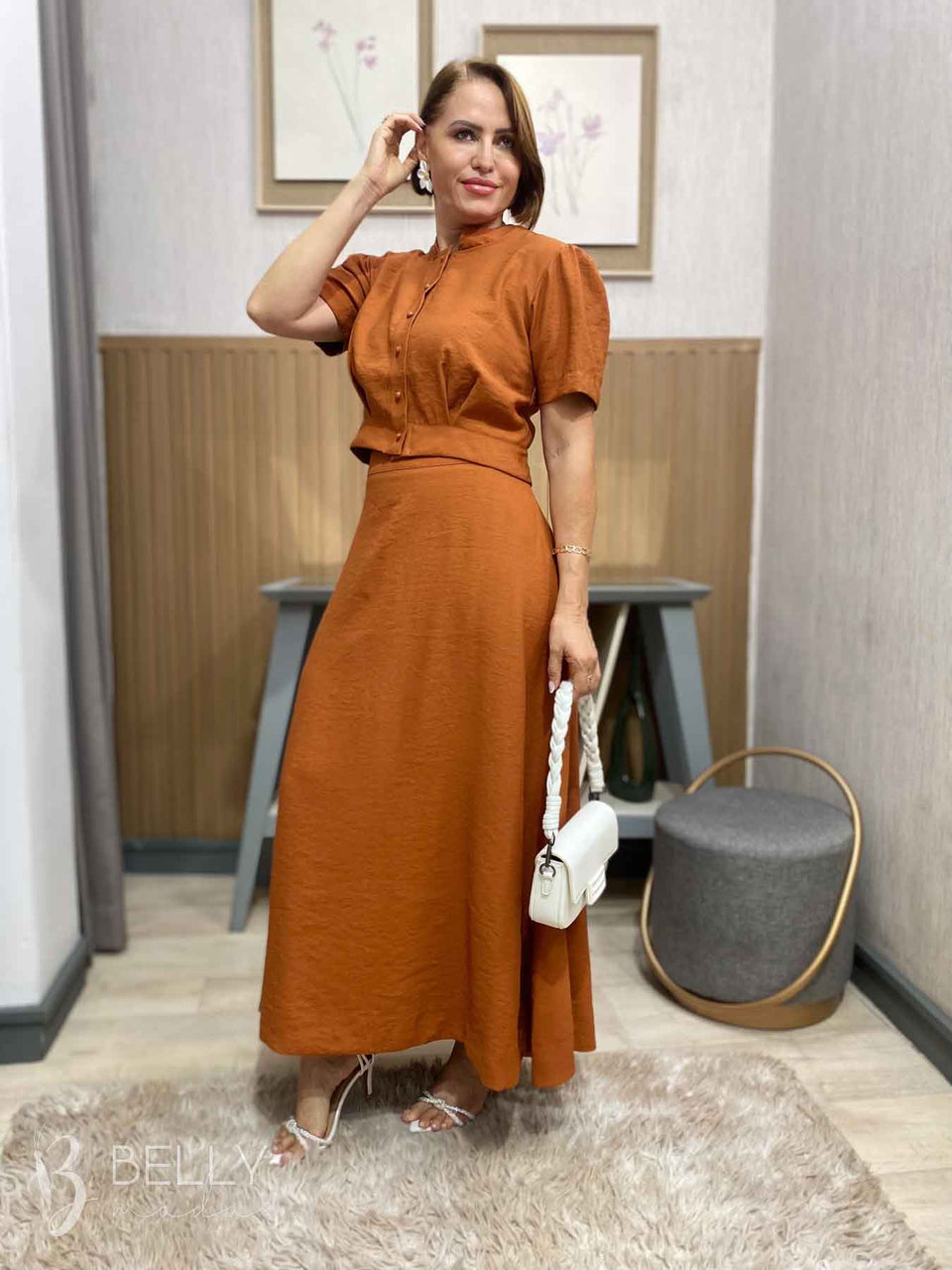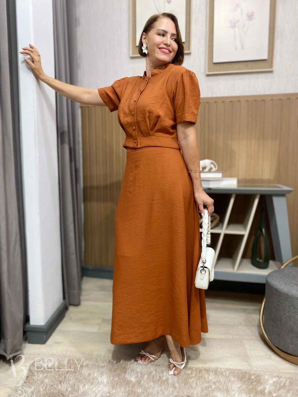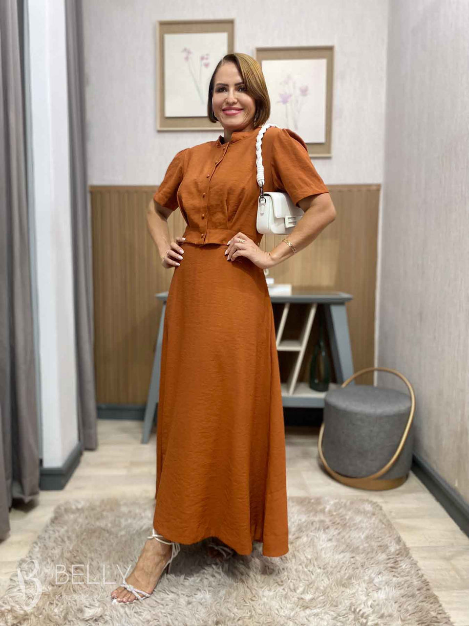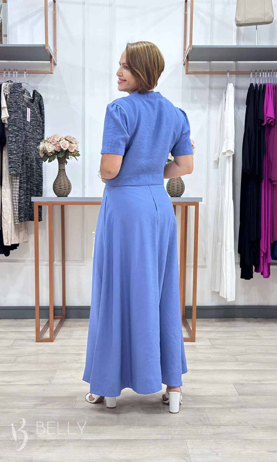 Conjunto Joana Max Midi da Belly Moda é uma opção elegante e versátil. Com modelagem evasê, o conjunto é confeccionado em tecido plano no corte alfaiataria. A blusa possui detalhe de franzido abaixo do busto, meia manga levemente bufante, gola mais fechada e fechamento em botões frontal. A saia também é evasê, com bolsos faca e fechamento em zíper na parte posterior, garantindo um comprimento max midi.