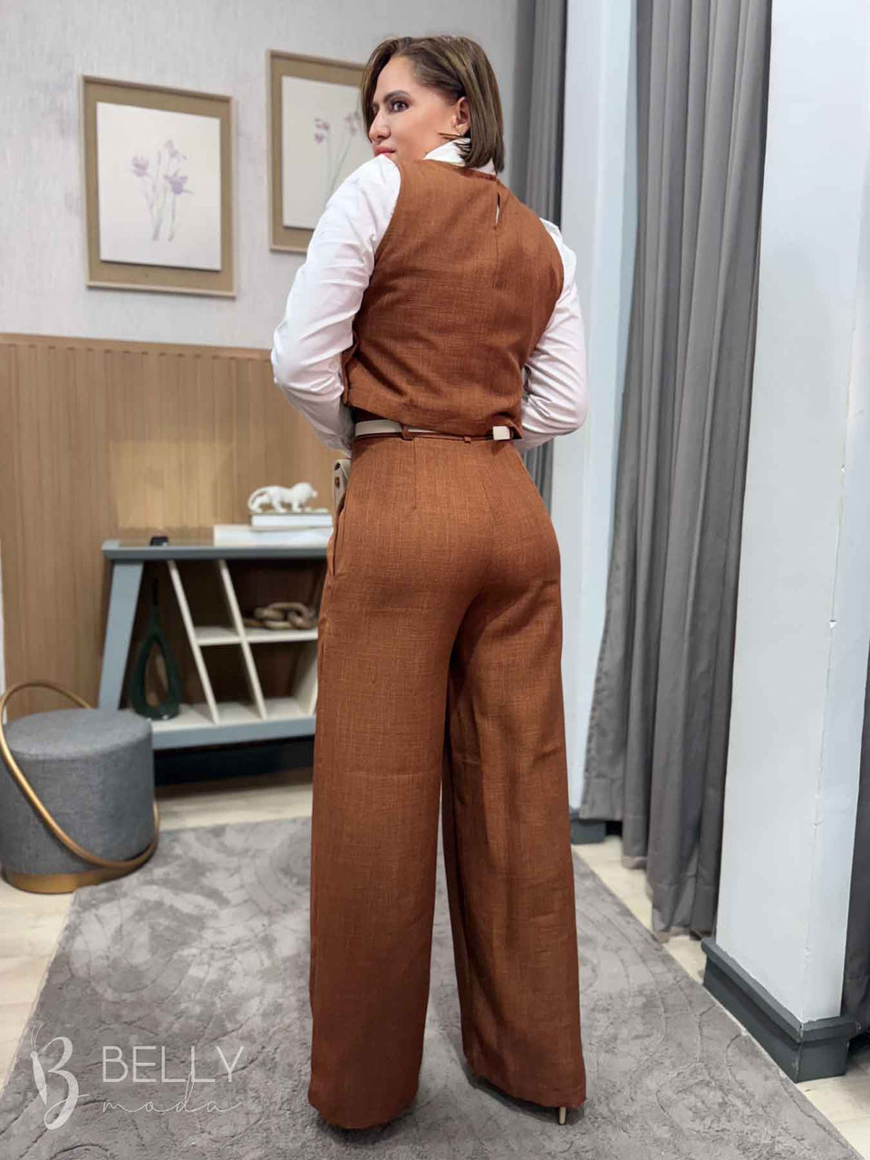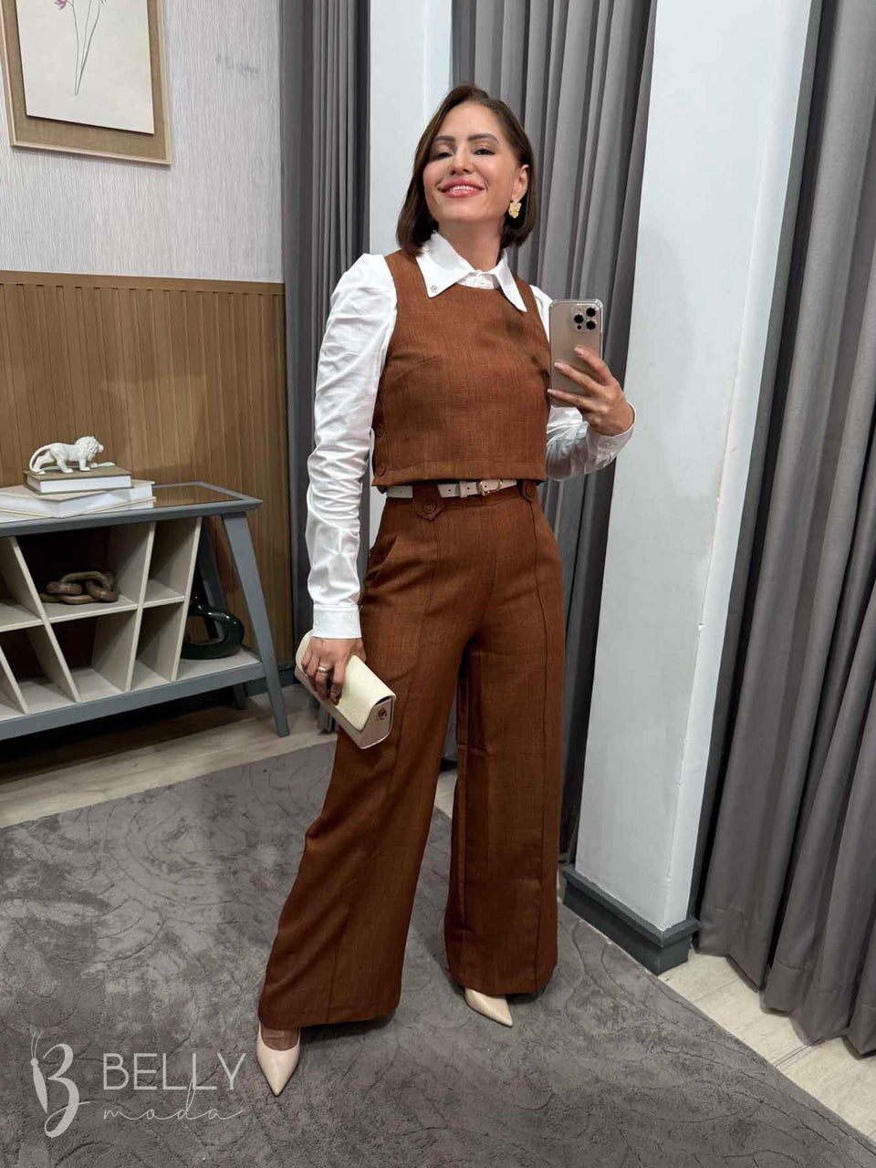 Conjunto Megan Calça e Colete, da Belly Moda, confeccionado em tecido plano de alfaiataria. O colete possui comprimento até a cintura, modelagem mais solta e detalhes de botões encapados laterais, conferindo elegância à peça. Além disso, possui uma leve abertura na parte posterior que finaliza com um fechamento em botão. A calça de cintura alta conta com passantes, bolso faca e fechamento em zíper lateral, em modelagem pantalona com detalhe em nervura frontal.