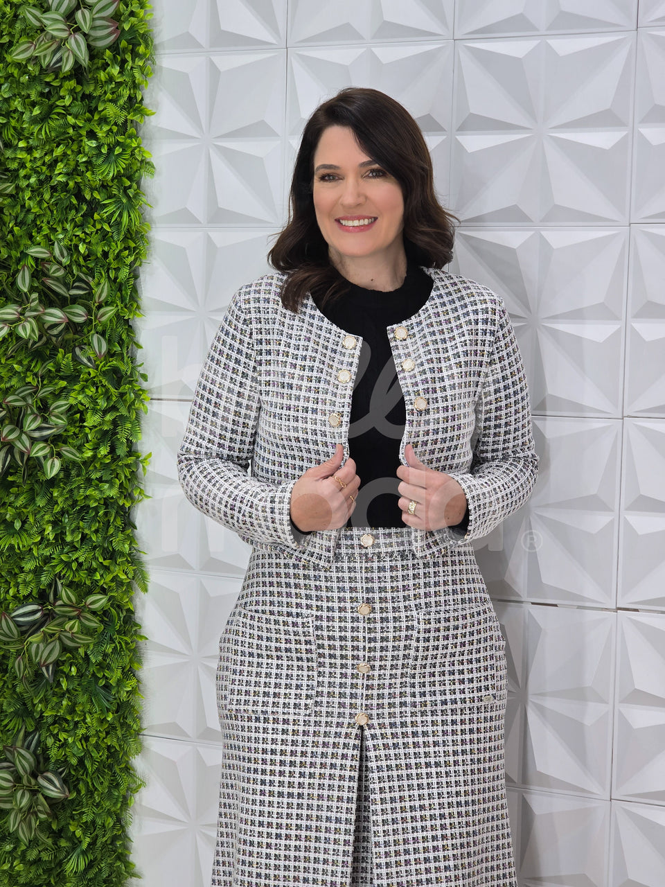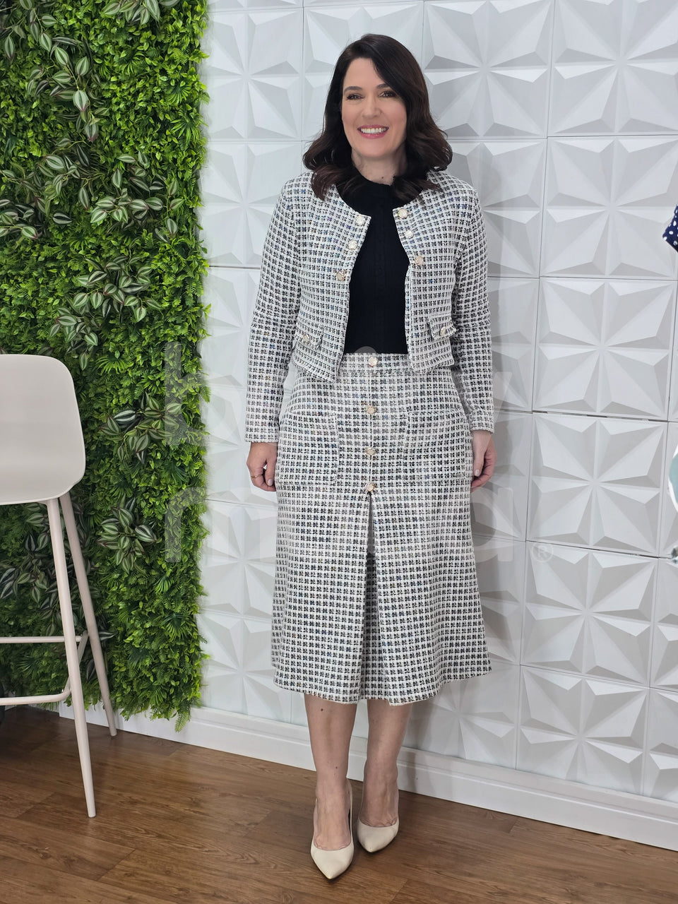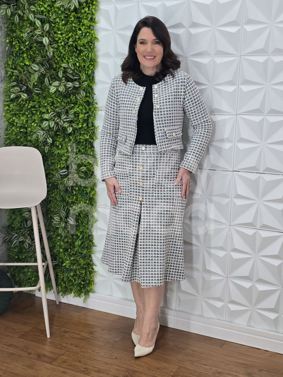 O Conjunto Beatriz é um clássico moderno que une sofisticação e conforto. Confeccionado em malha tweed com toque estruturado e agradável, o modelo traz um visual refinado com seu padrão xadrez discreto. A saia com comprimento midi e modelagem evasê valoriza a silhueta com elegância, enquanto o casaqueto com botões decorativos adiciona charme e acabamento impecável à produção.
