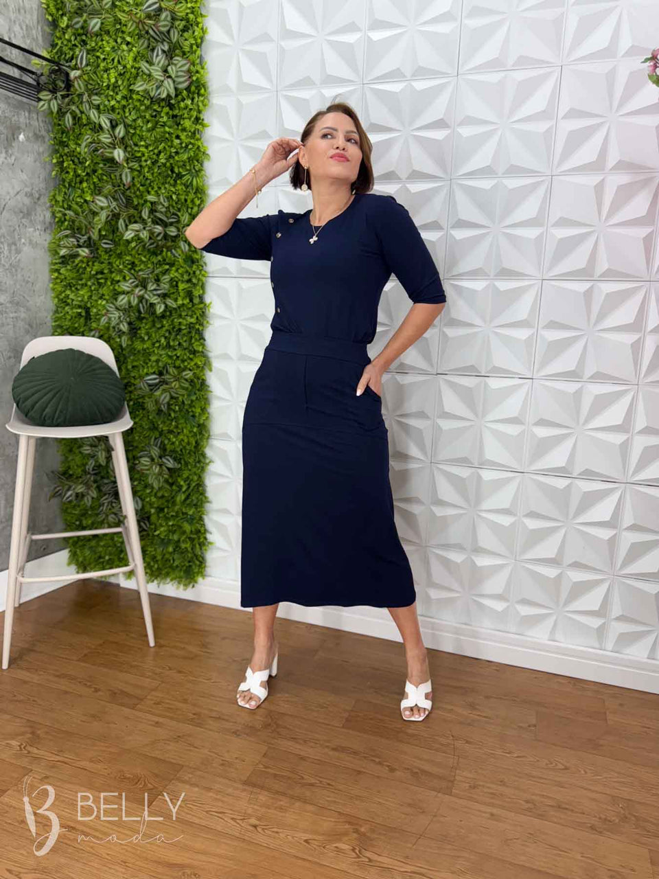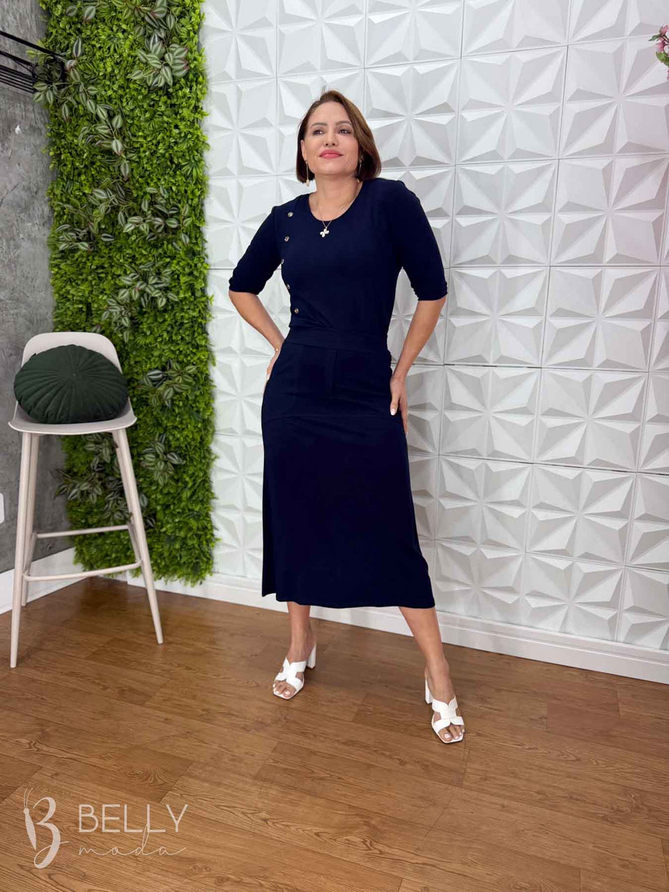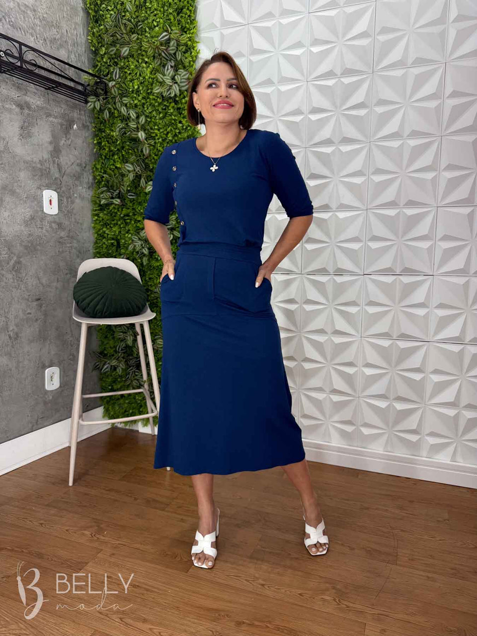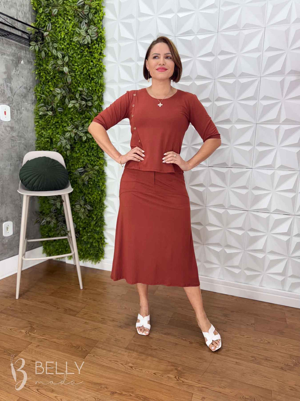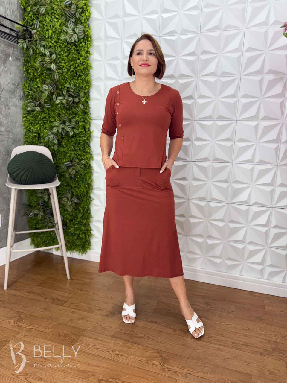 Conjunto Poliana Midi da marca Belly Moda, com modelagem mais ajustada até a altura do quadril e levemente evasê na parte inferior. Confeccionado em malha viscolycra premium lisa, possui manga 3/4 e gola careca. Destaque para o recorte vertical lateral com acabamento em botões decorativos, que dão identidade à peça. A saia conta com bolso lateral funcional e é forrada. O cós largo todo pespontado proporciona estrutura e firmeza, com comprimento midi. Um conjunto com acabamento impecável, perfeito para diversas ocasiões.