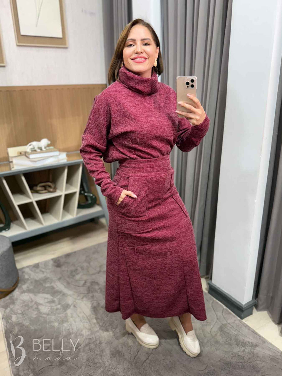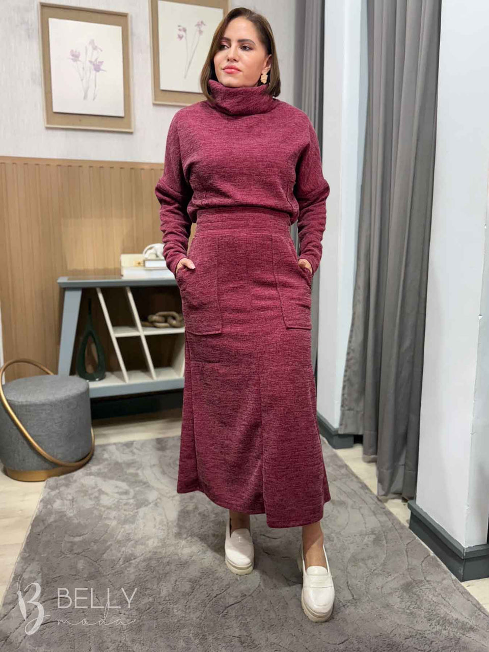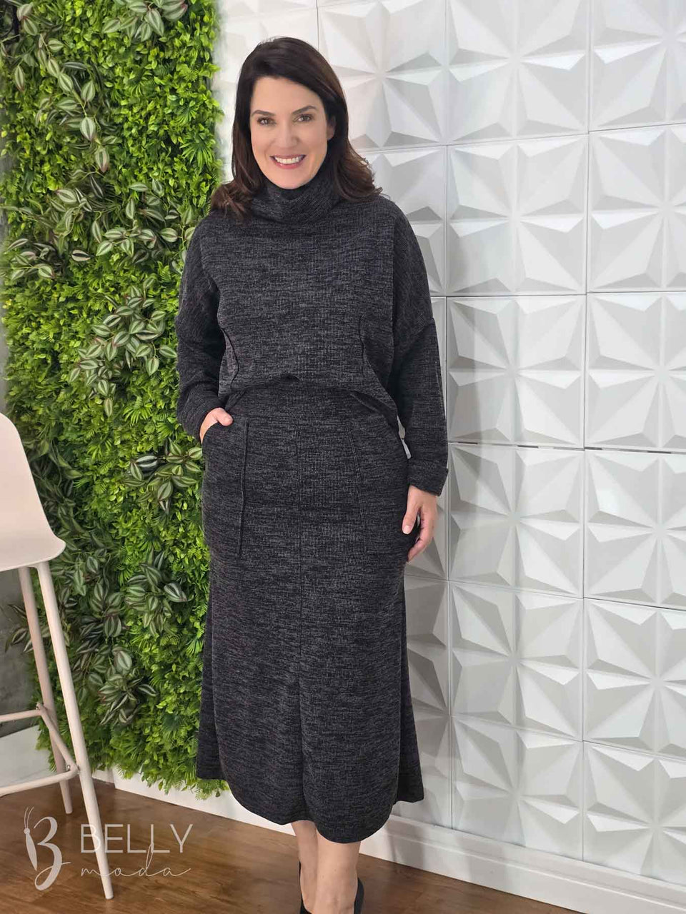Conjunto Silvana Max Midi da marca Belly Moda, com modelagem levemente evasê e confeccionado em ribana canelada. Possui manga longa com punho e gola boba alta. Na saia, conta com bolsos utilitários na parte frontal, proporcionando praticidade. Seu comprimento é max midi, ideal para diversas ocasiões.
