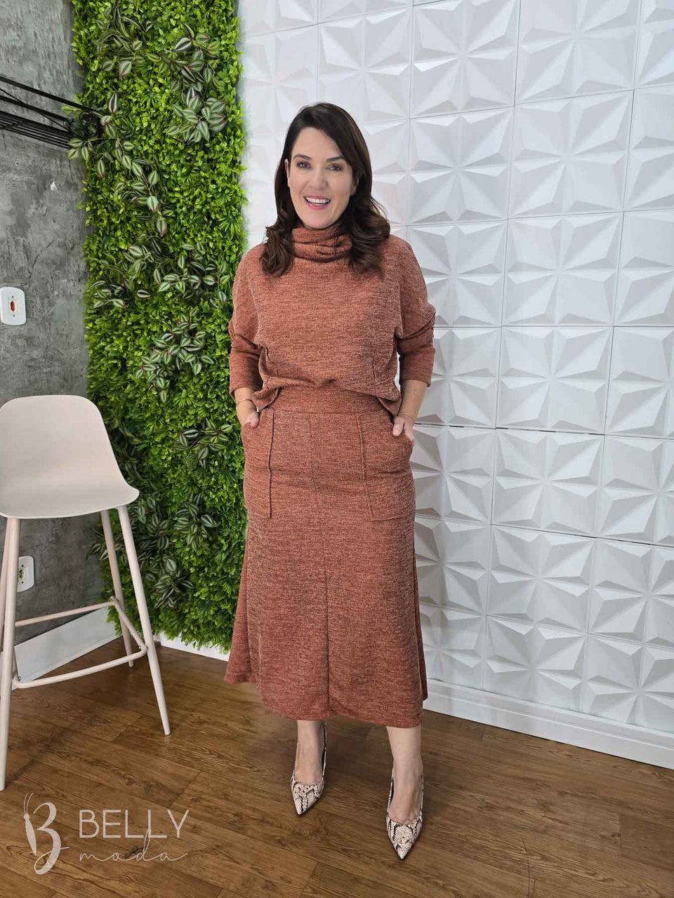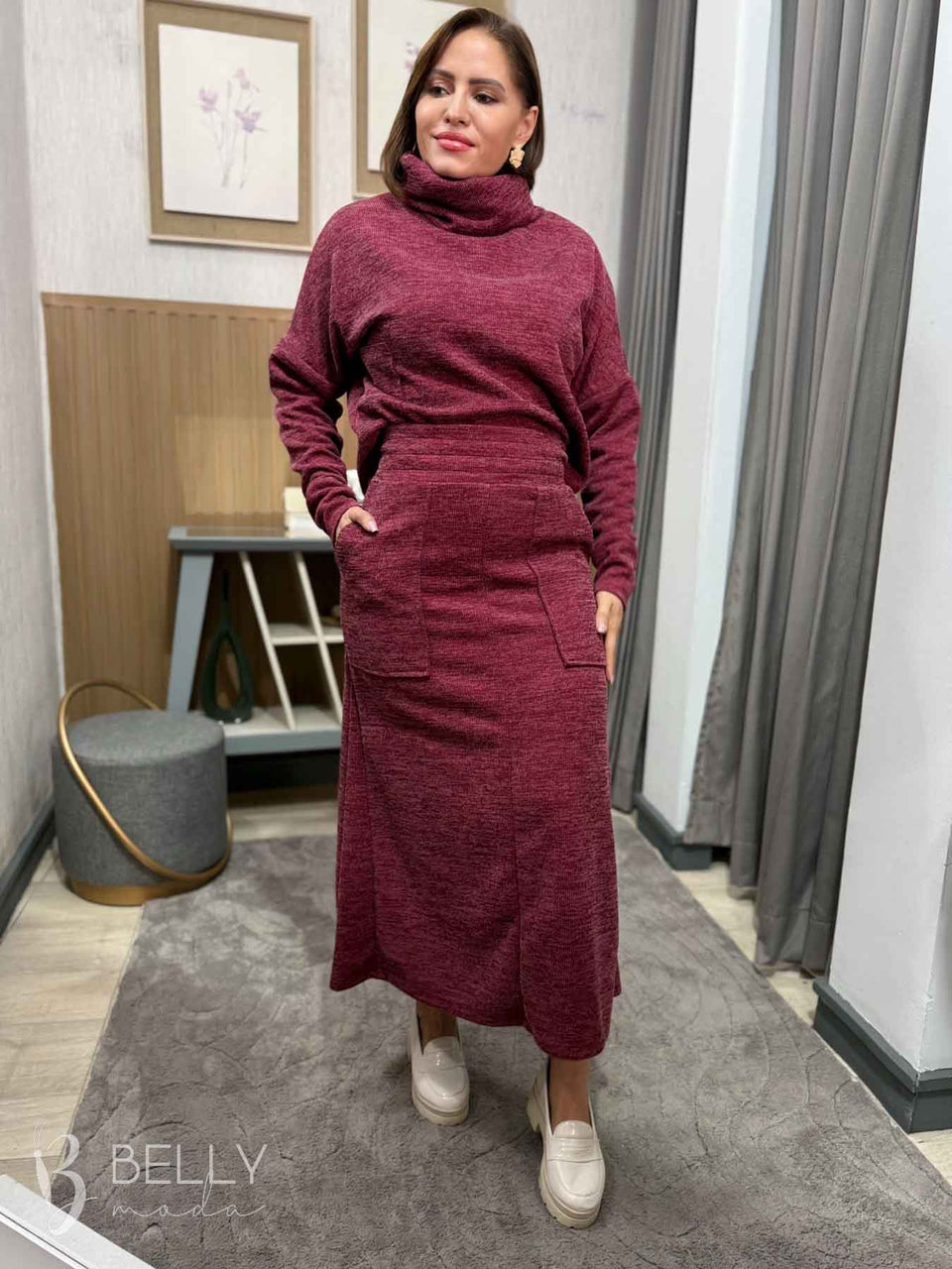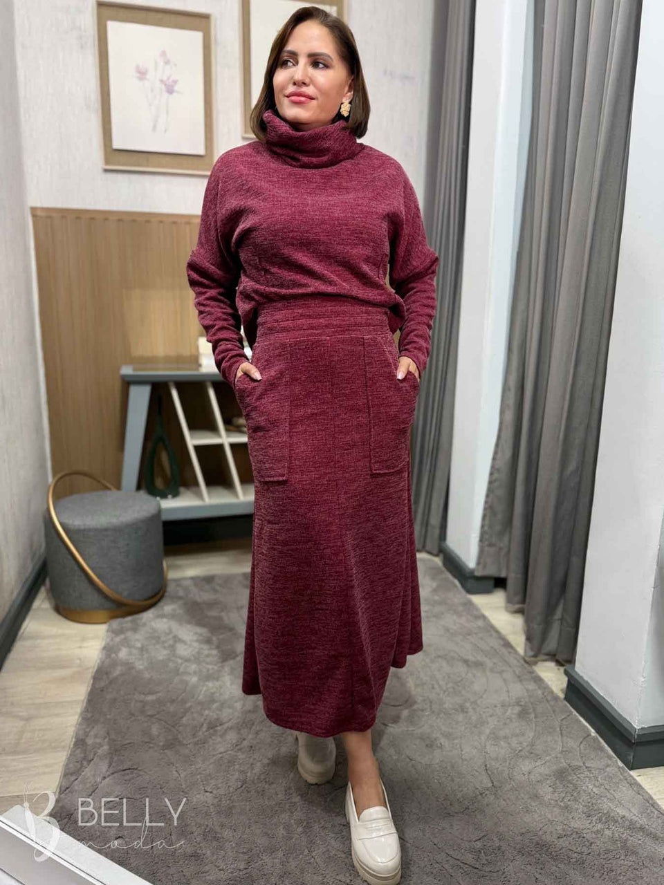 Conjunto Silvana Max Midi da marca Belly Moda, com modelagem levemente evasê e confeccionado em ribana canelada. Possui manga longa com punho e gola boba alta. Na saia, conta com bolsos utilitários na parte frontal, proporcionando praticidade. Seu comprimento é max midi, ideal para diversas ocasiões.