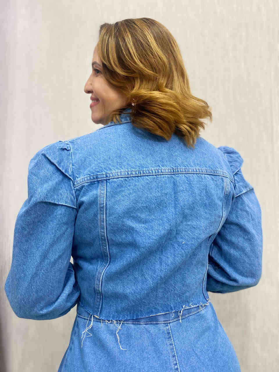 Jaqueta Betina Cropped da Belly Moda é confeccionada em jeans sarjado, proporcionando conforto e estilo. Possui manga longa bufante com abotoamento no punho, fechamento por botões forrado com o mesmo tecido no comprimento cropped. O tecido com pouco elastano garante um caimento perfeito, ideal para compor looks do dia a dia com muito charme.