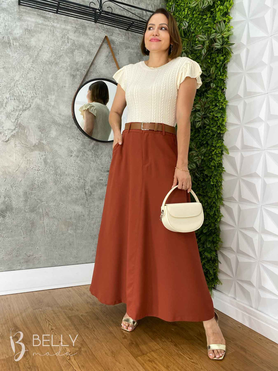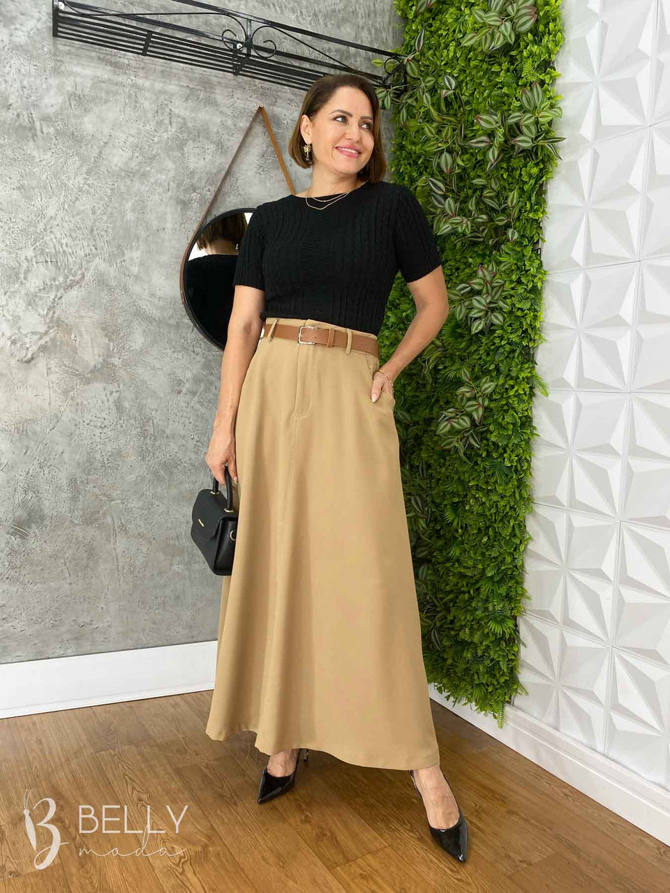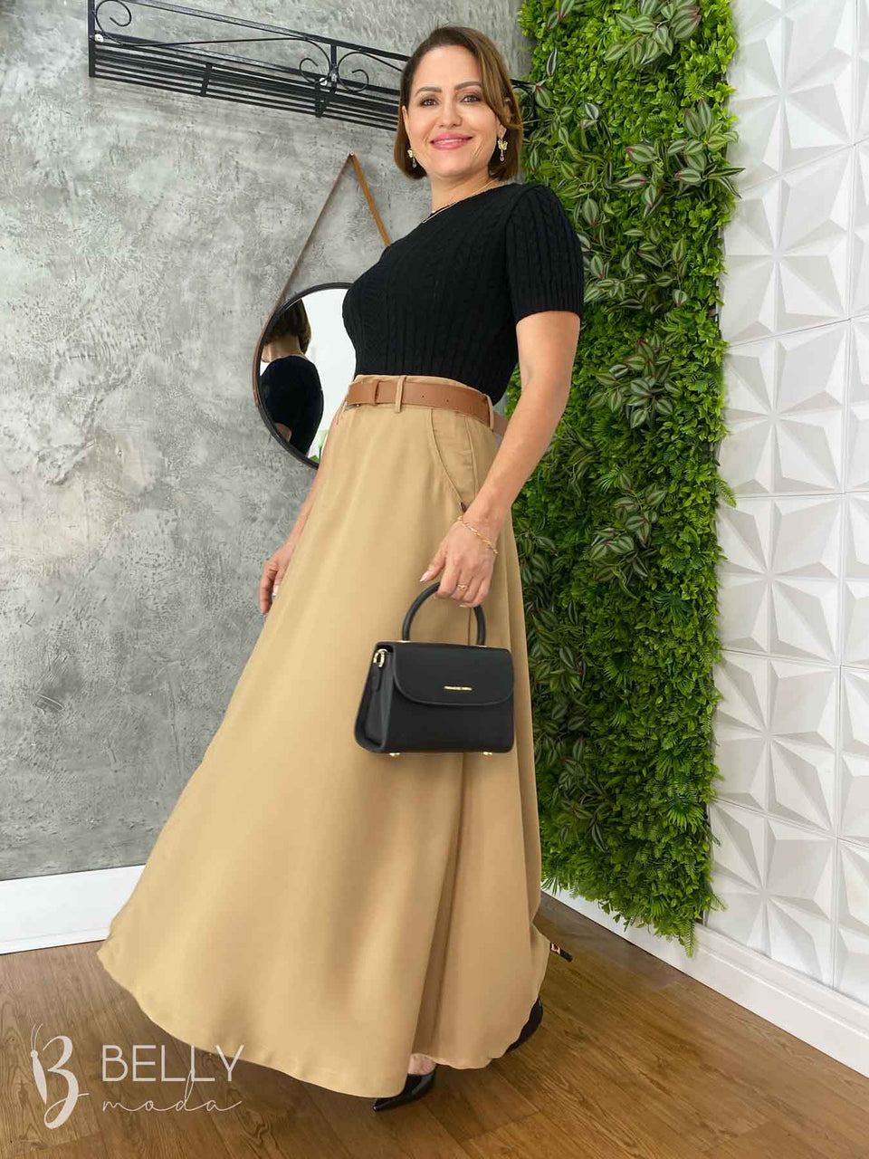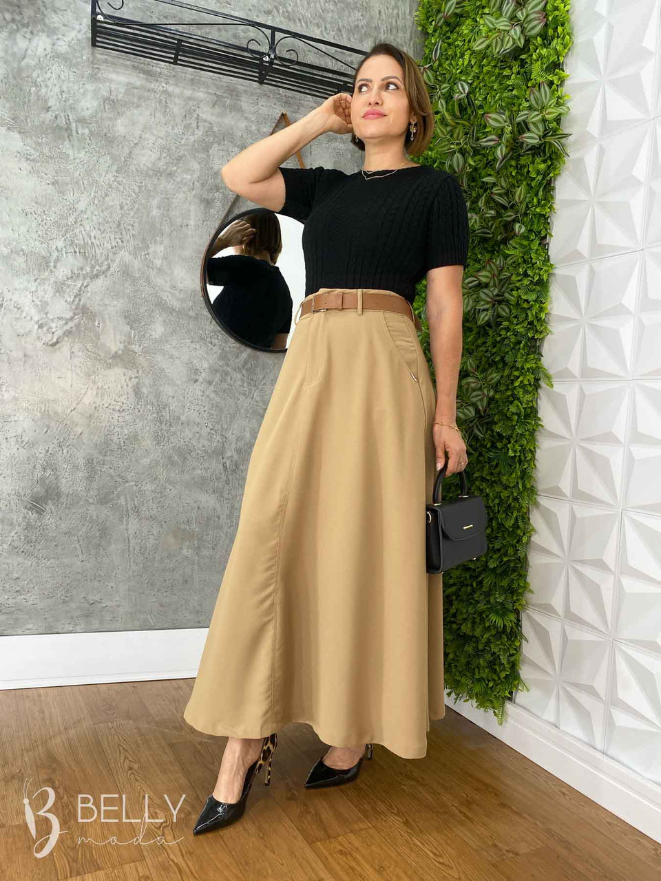 A saia longa godê da Belly Moda é confeccionada em tecido plano alfaiataria, proporcionando um caimento elegante e sofisticado. Com modelagem godê, possui bolso faca, passantes com cinto, fechamento em zíper e botão frontal, e comprimento longo, ideal para compor looks versáteis e cheios de estilo.
