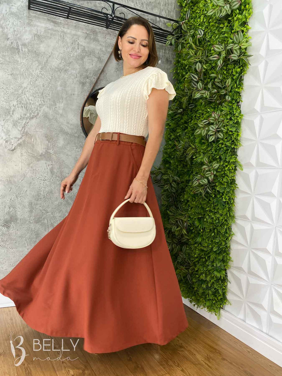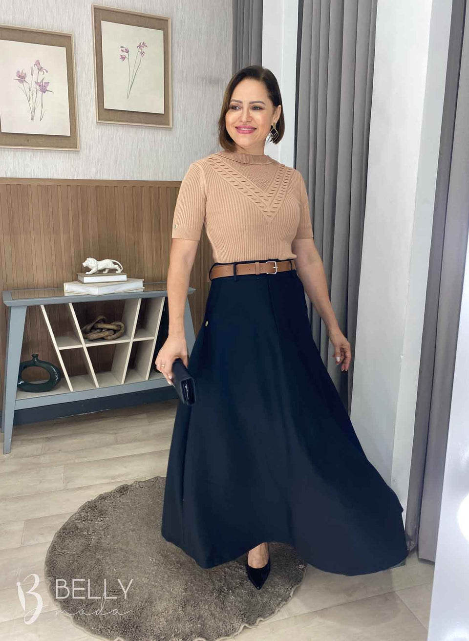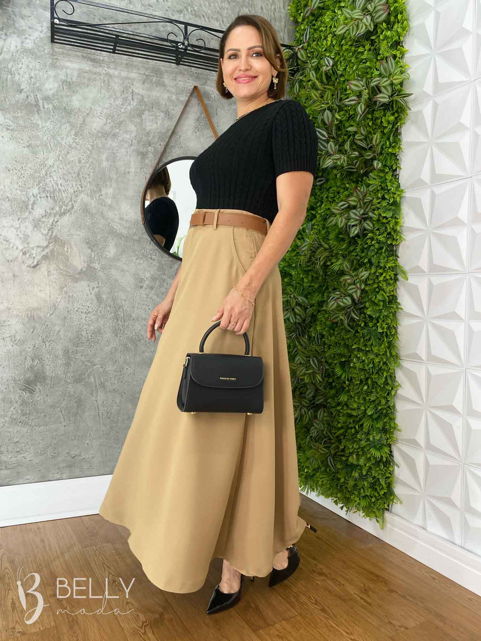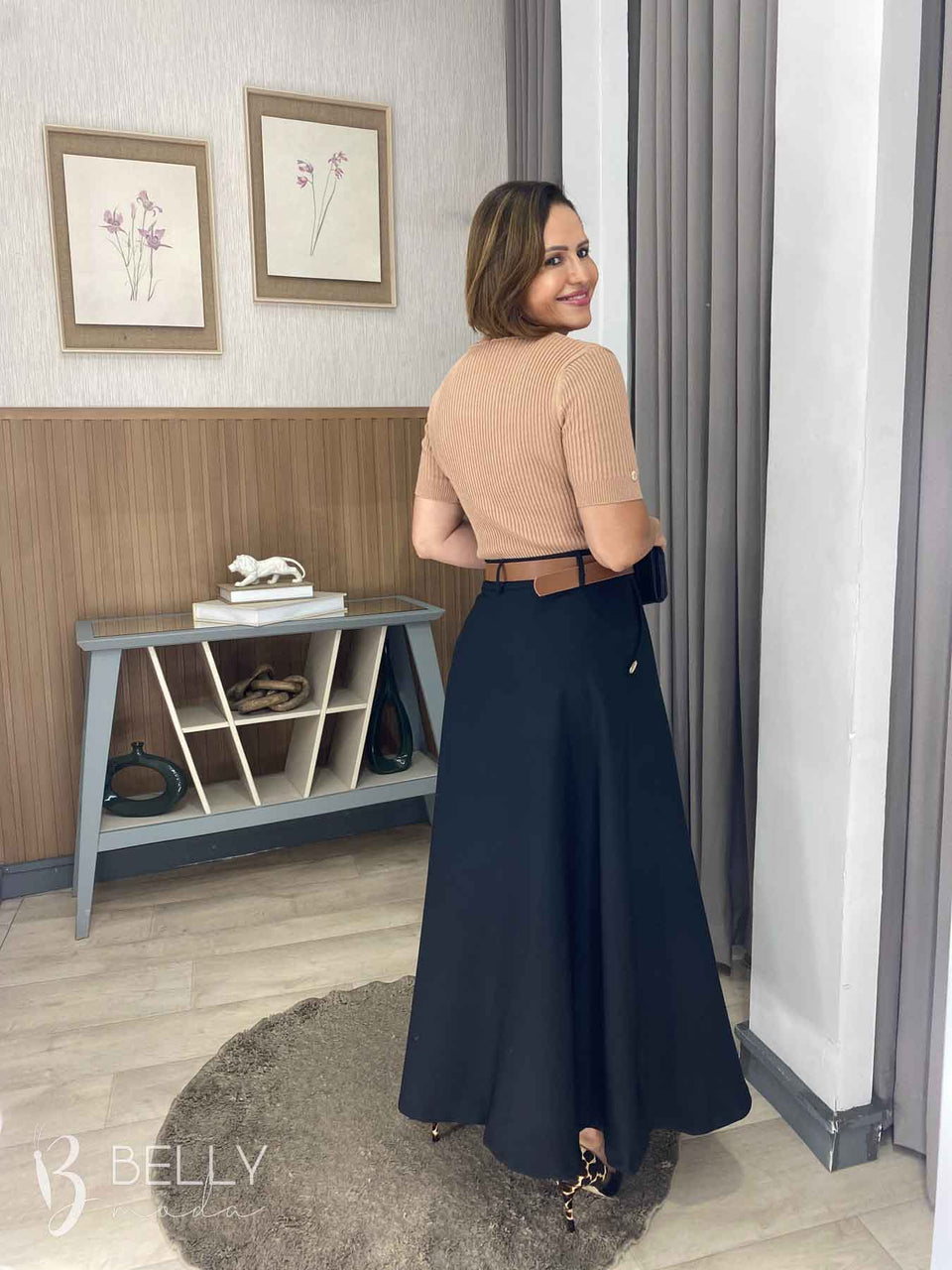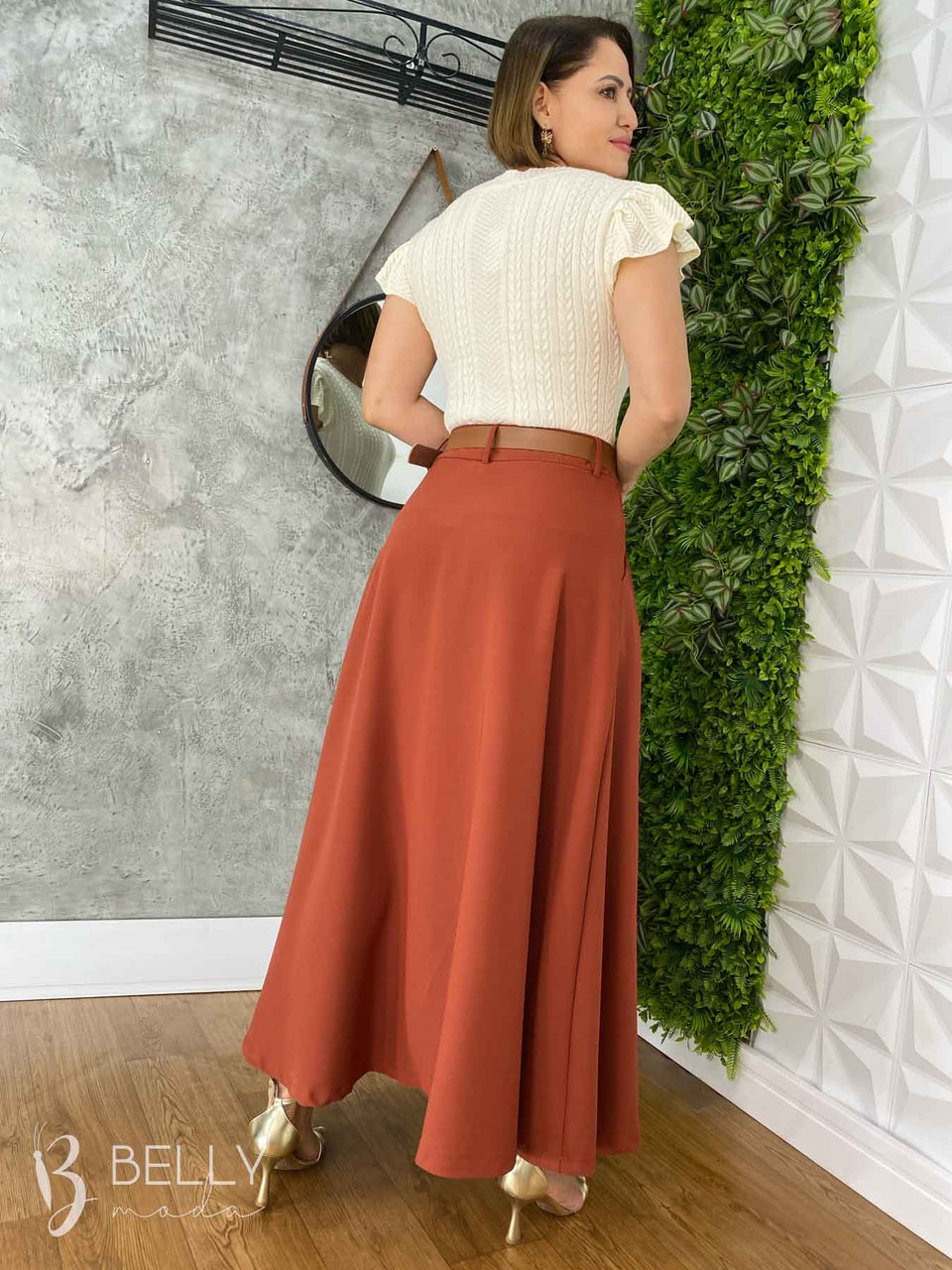 A saia longa godê da Belly Moda é confeccionada em tecido plano alfaiataria, proporcionando um caimento elegante e sofisticado. Com modelagem godê, possui bolso faca, passantes com cinto, fechamento em zíper e botão frontal, e comprimento longo, ideal para compor looks versáteis e cheios de estilo.