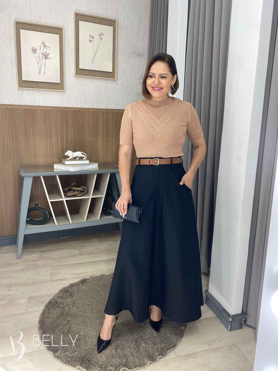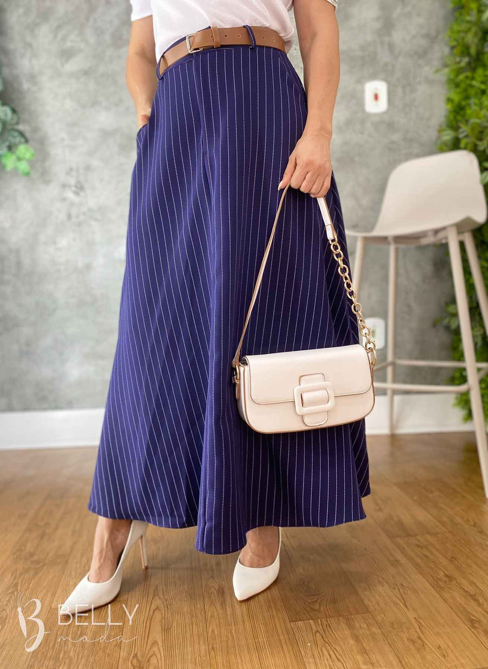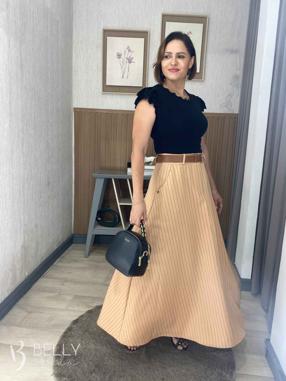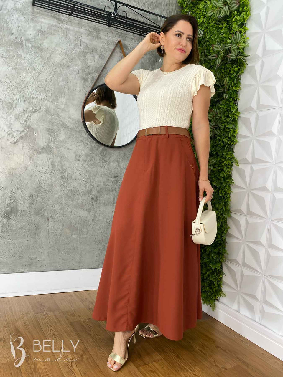 A saia longa godê da Belly Moda é confeccionada em tecido plano alfaiataria, proporcionando um caimento elegante e sofisticado. Com modelagem godê, possui bolso faca, passantes com cinto, fechamento em zíper e botão frontal, e comprimento longo, ideal para compor looks versáteis e cheios de estilo.