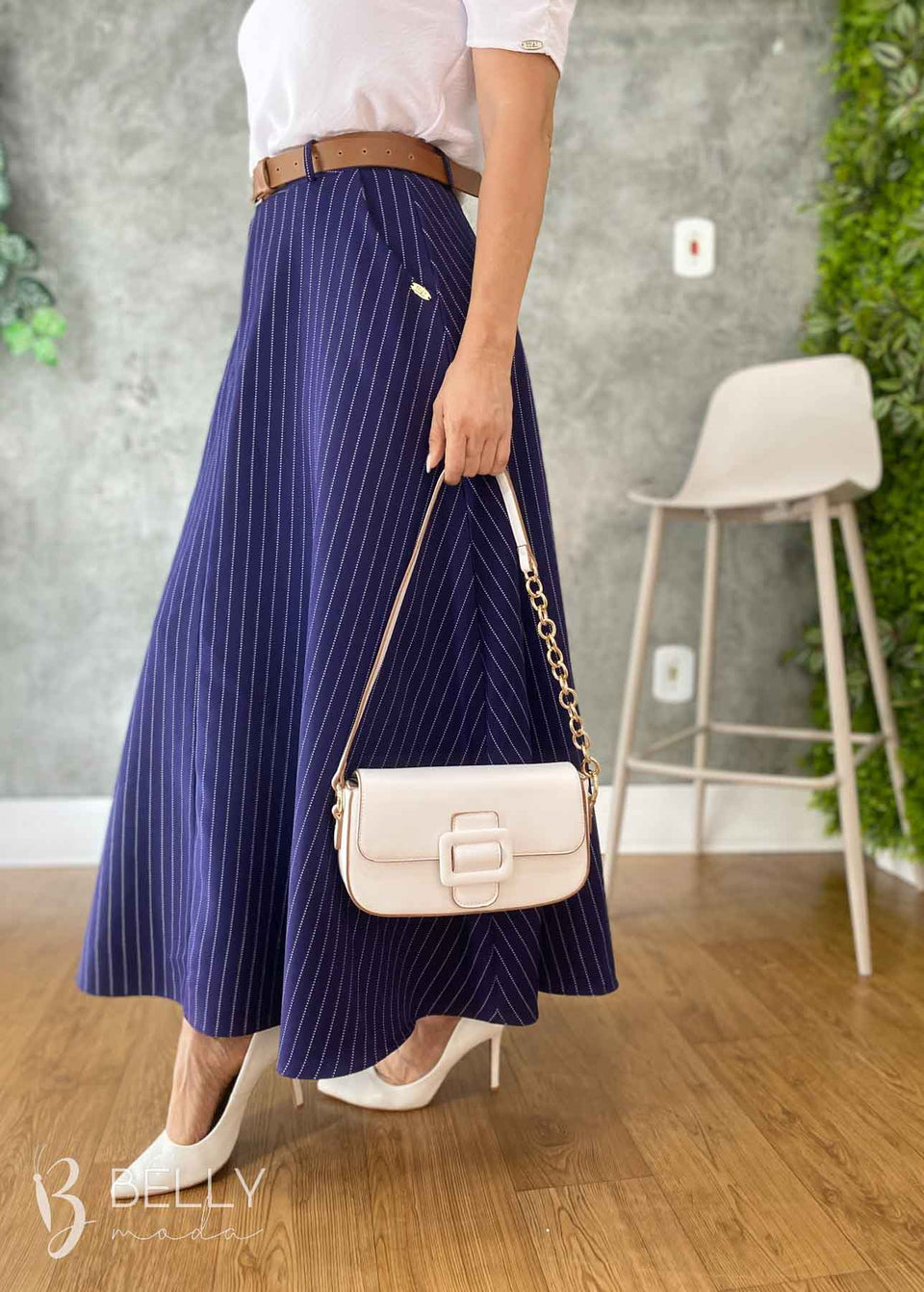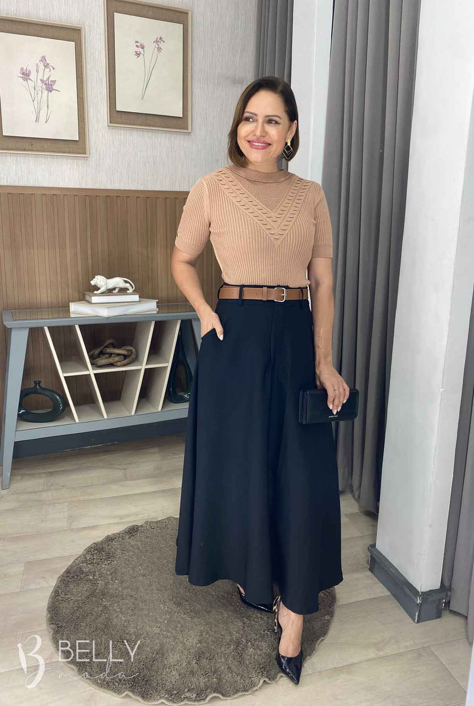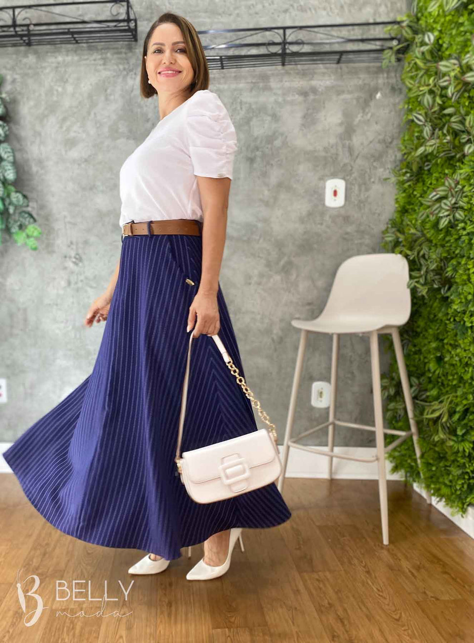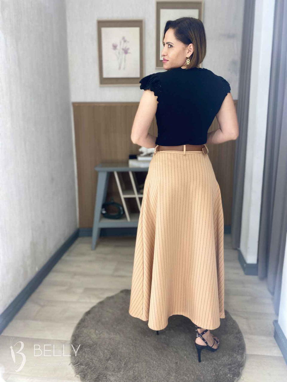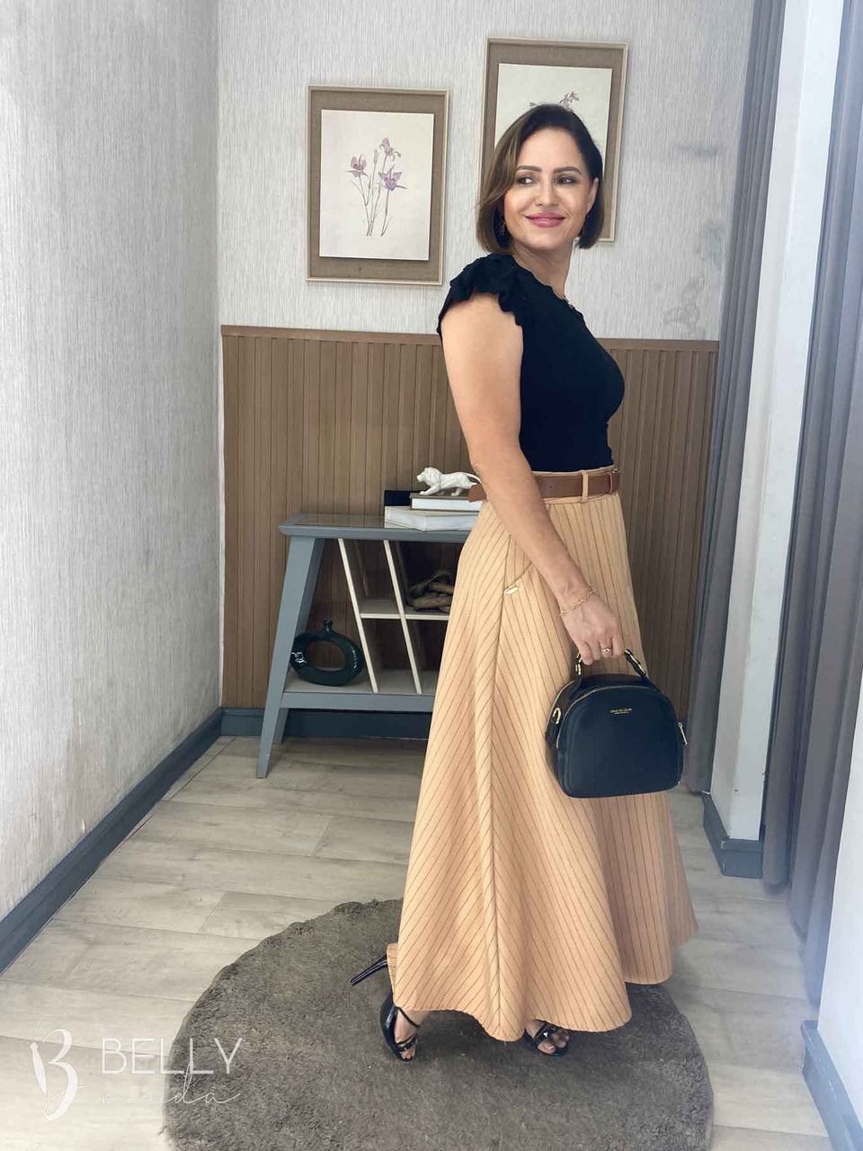 A saia longa godê da Belly Moda é confeccionada em tecido plano alfaiataria, proporcionando um caimento elegante e sofisticado. Com modelagem godê, possui bolso faca, passantes com cinto, fechamento em zíper e botão frontal, e comprimento longo, ideal para compor looks versáteis e cheios de estilo.