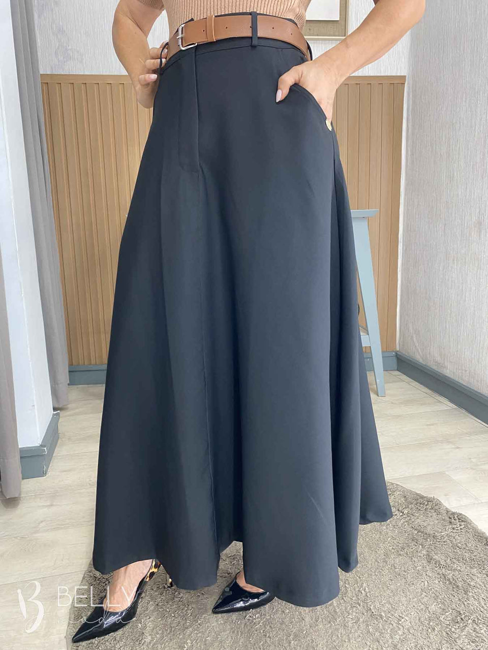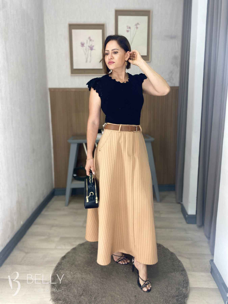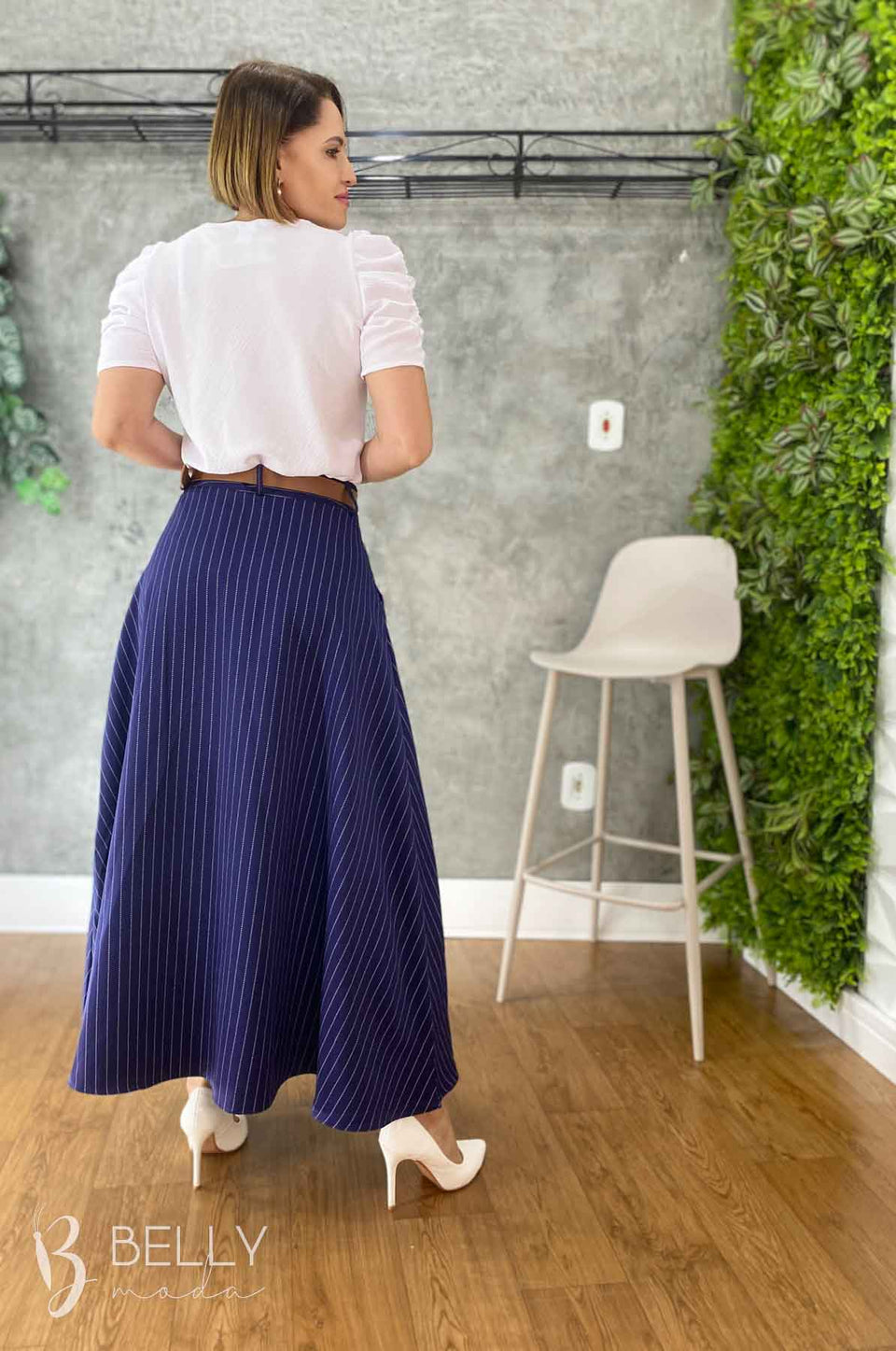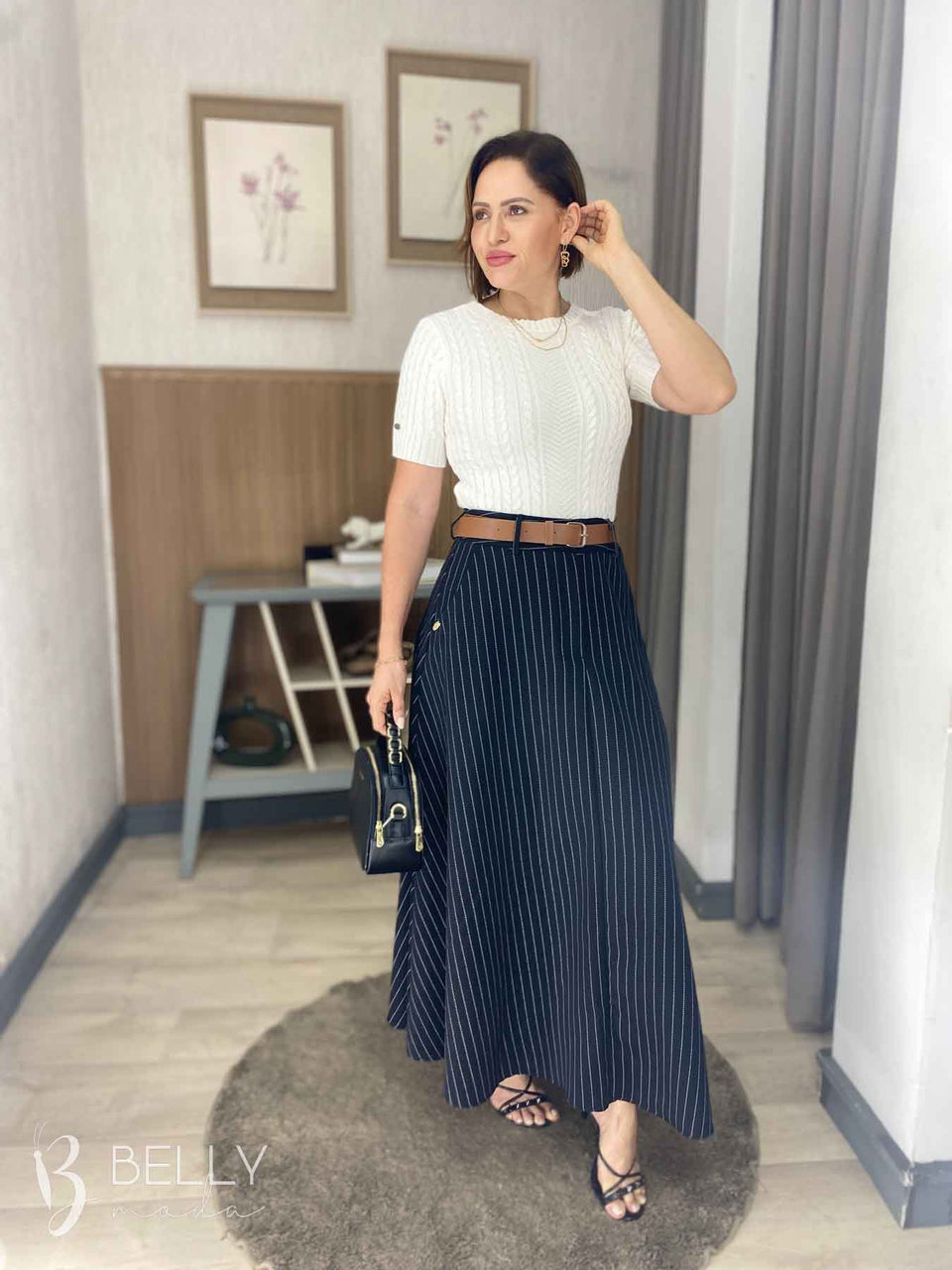 A saia longa godê da Belly Moda é confeccionada em tecido plano alfaiataria, proporcionando um caimento elegante e sofisticado. Com modelagem godê, possui bolso faca, passantes com cinto, fechamento em zíper e botão frontal, e comprimento longo, ideal para compor looks versáteis e cheios de estilo.