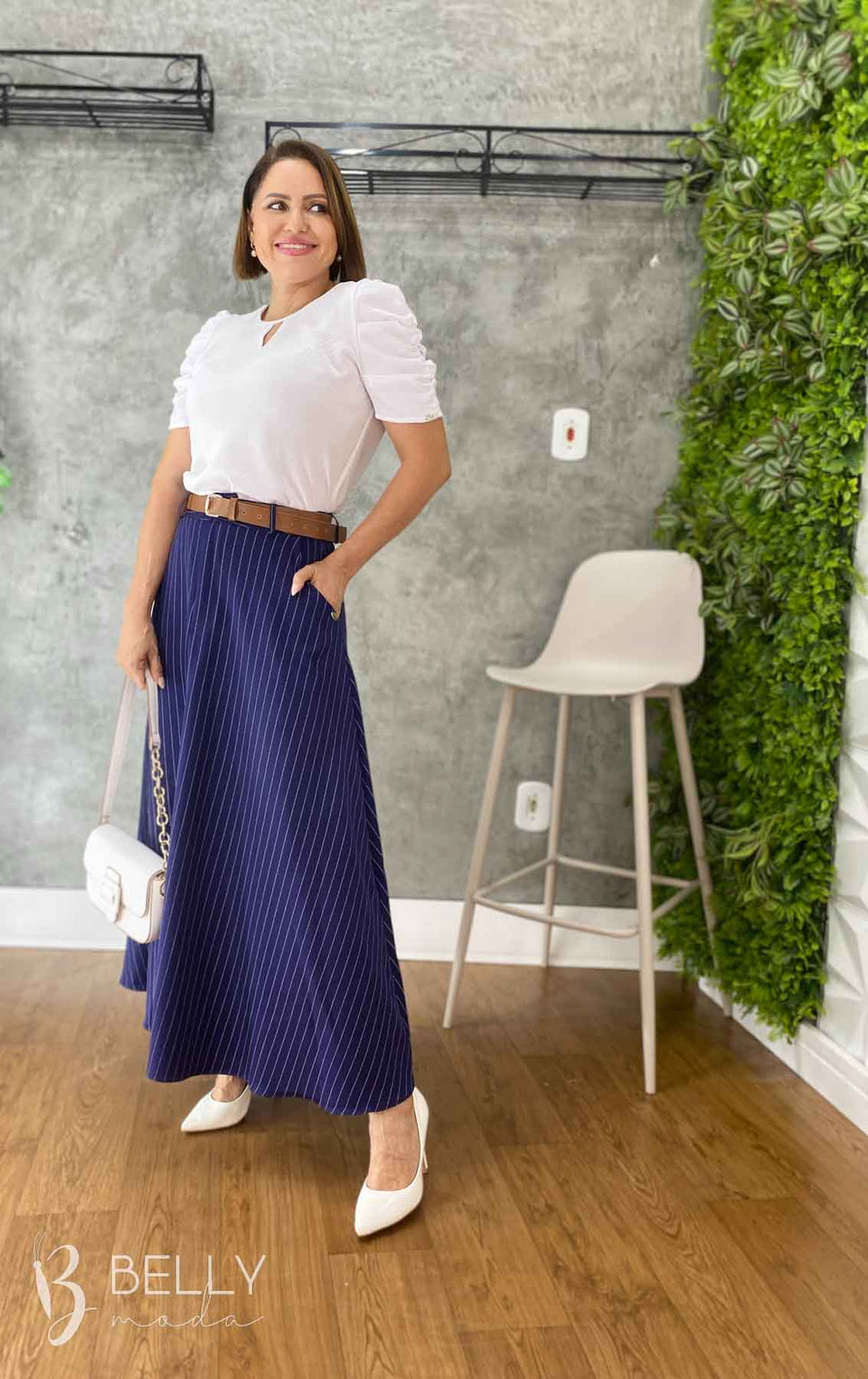 Combine a saia longa godê com uma blusa básica para um look casual elegante, ou aposte em uma blusa mais sofisticada para um visual mais refinado.