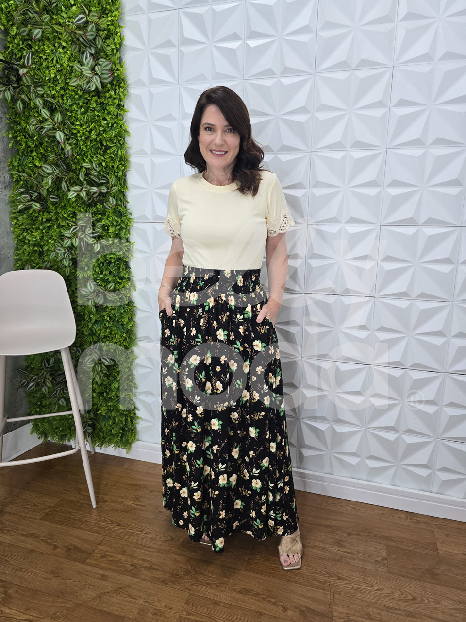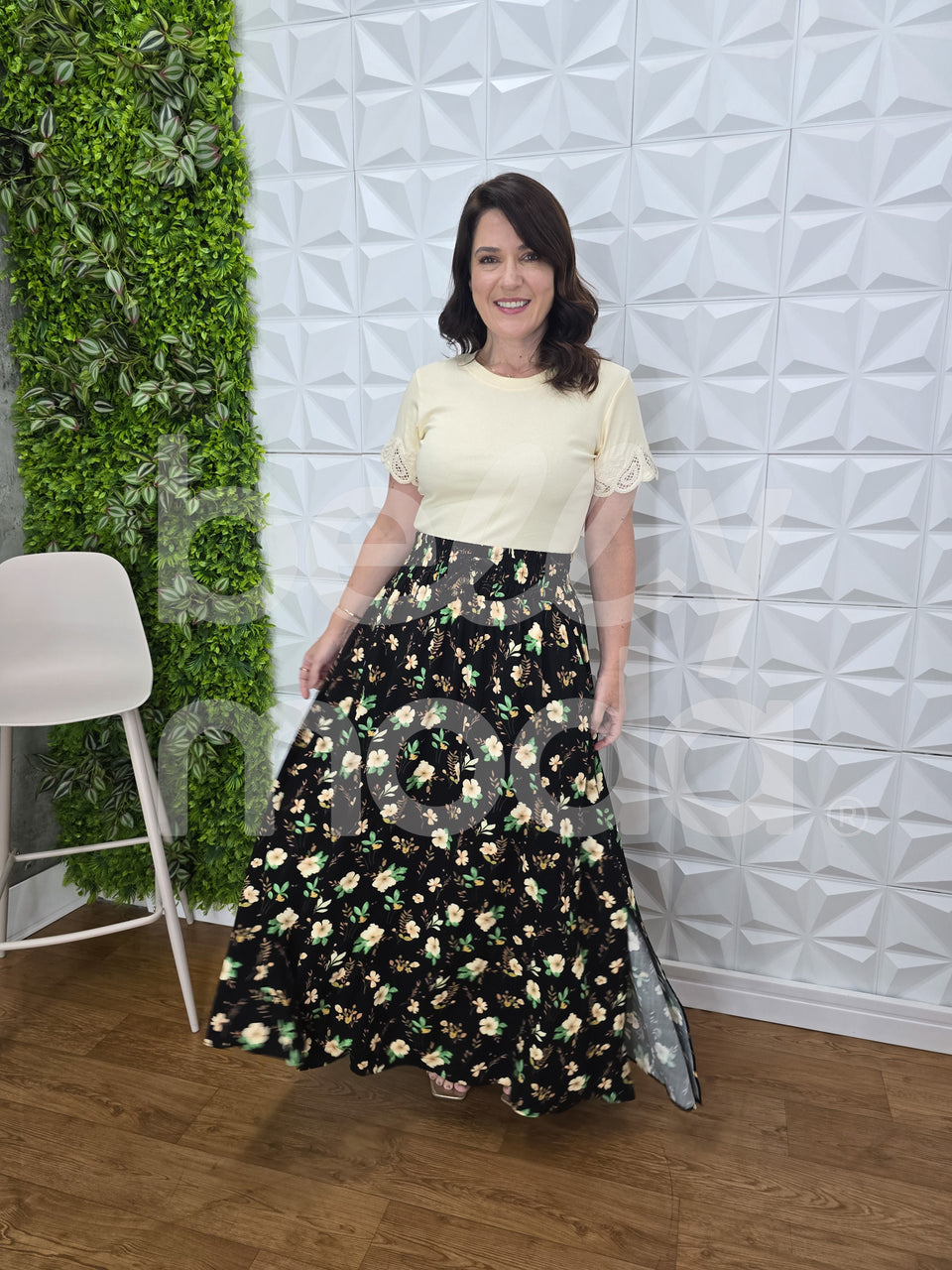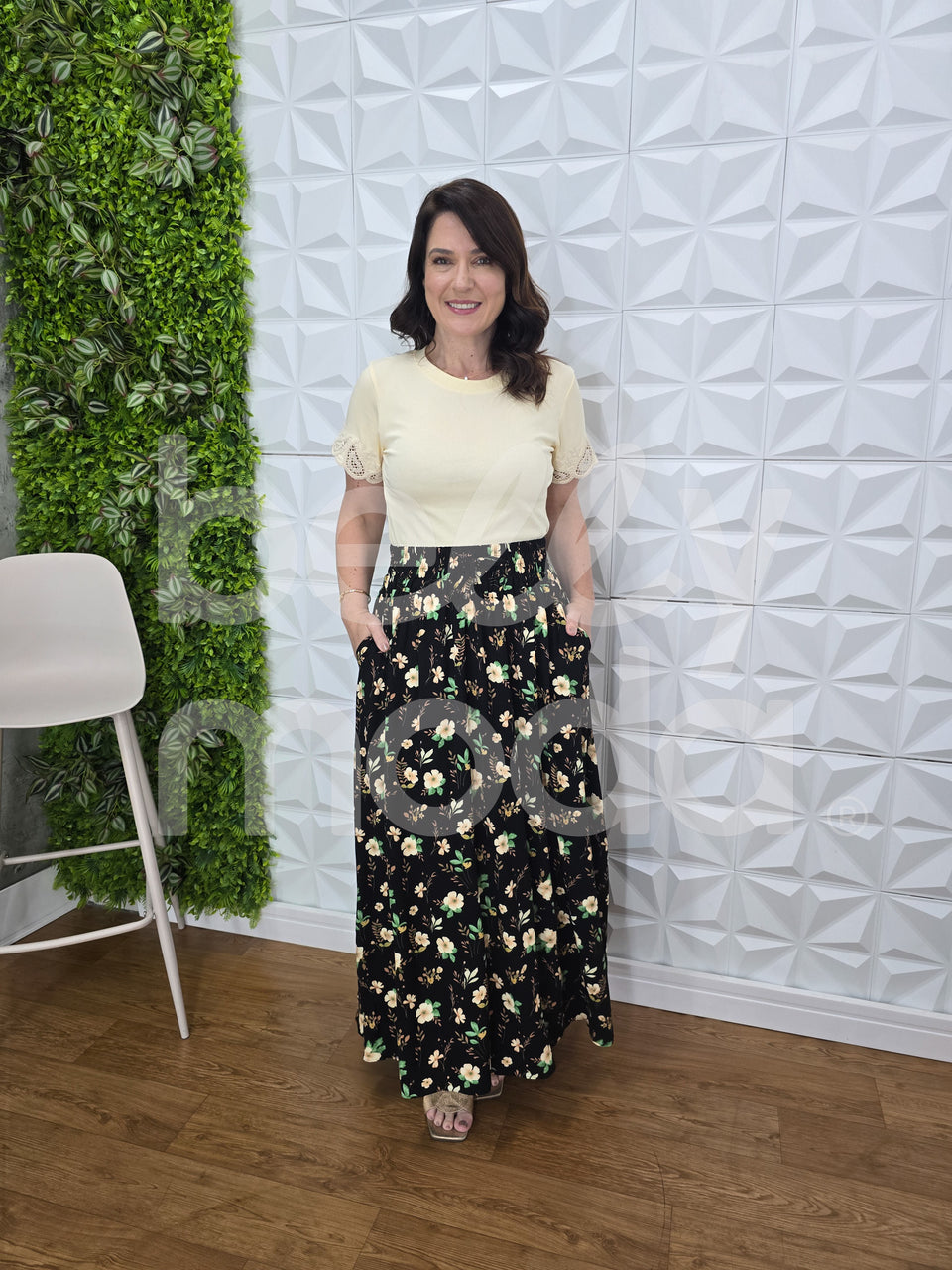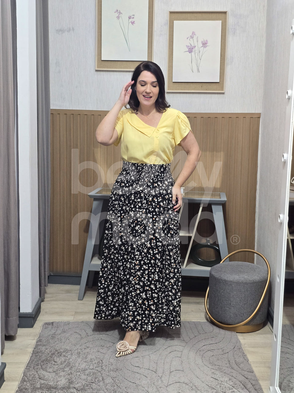A saia Drika com bolso Max Midi da marca Belly Moda é confeccionada em viscose, com modelagem godê. Possui bolsos laterais, cós largo todo costurado no lastex para um ajuste perfeito, fenda lateral e comprimento longo. Uma peça versátil e confortável, perfeita para diversas ocasiões.