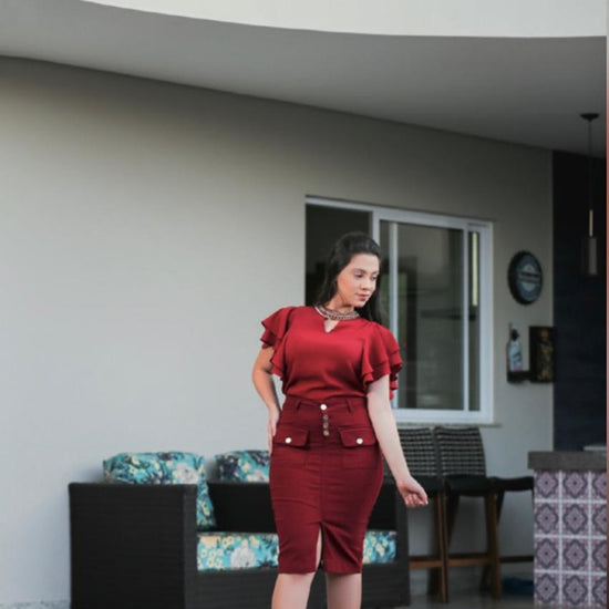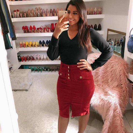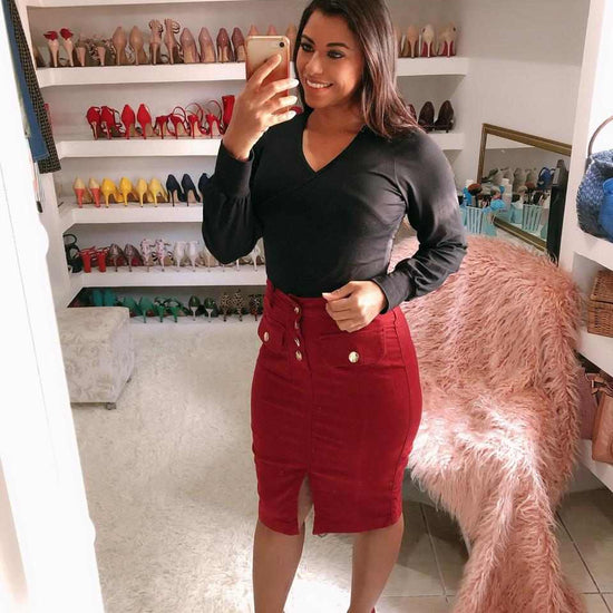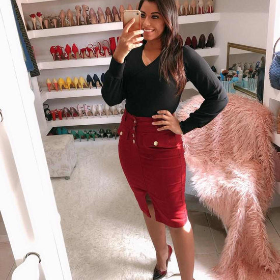 Combine a Saia em Sarja Midi com Fenda Frontal da Vecchi Jeans com uma blusa básica para um look casual, ou com um body e salto alto para uma produção mais sofisticada.