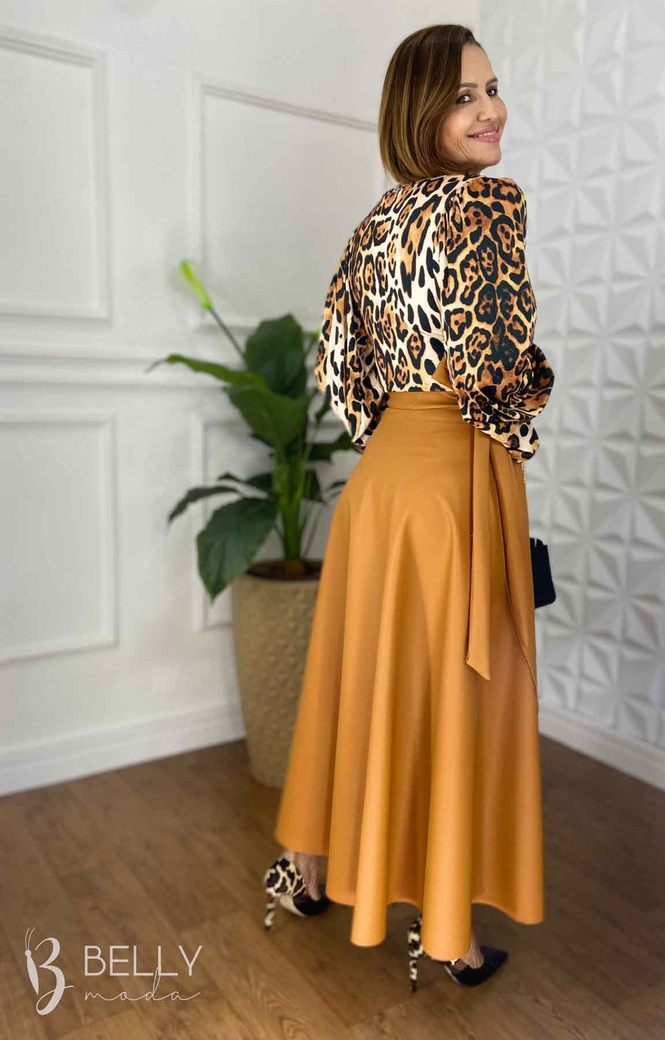 Descrição: Saia envelope em couro PU ecológico da Belly Moda. Com modelagem levemente evasê e comprimento midi mulet, esta saia proporciona regulagem e ajuste por ser um modelo envelope. Possui transpasse com faixa embutida para amarração, sendo uma peça versátil e de fácil combinação.