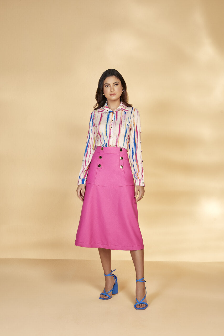Combine a saia evasê pink com uma blusa neutra e um salto para um look sofisticado, ou com uma t-shirt e tênis para um visual mais casual.