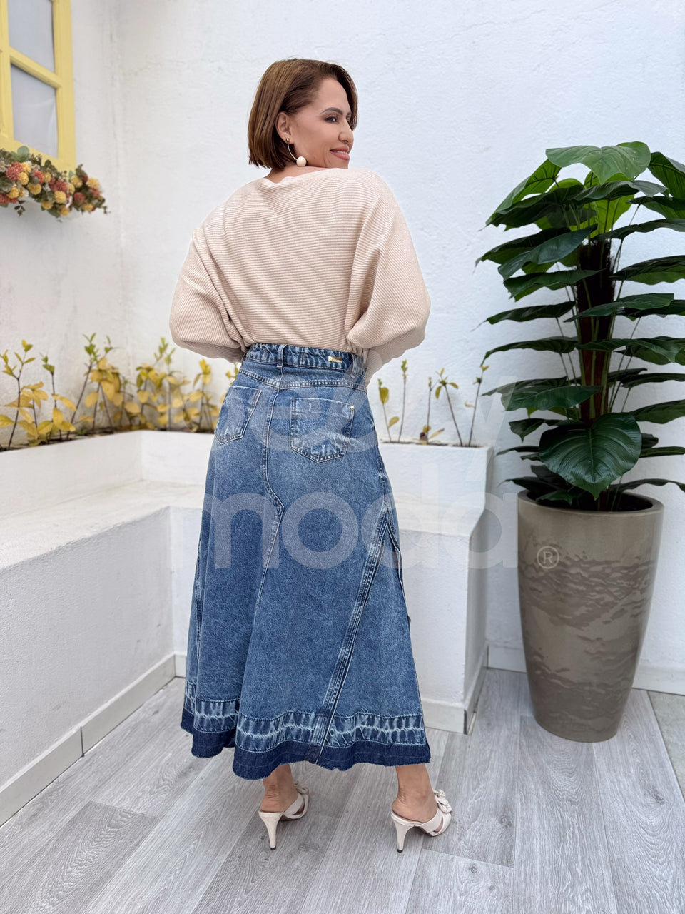 Confeccionada em jeans de lavagem escura, trazendo sofisticação e modernidade. Com 90 cm de comprimento, possui caimento confortável e recortes inteligentes que valorizam a silhueta. Um modelo versátil, perfeito para compor looks casuais e elegantes.