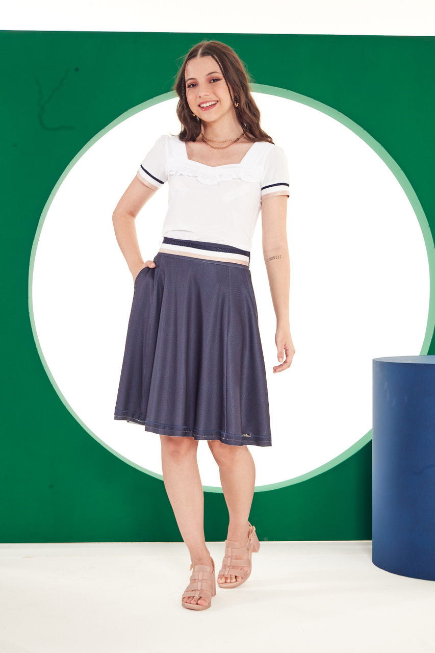 Combine a Saia Godê em Moletinho com uma blusa básica e um tênis para um look casual e despojado, ou com uma blusa mais elegante e saltos para uma produção sofisticada.