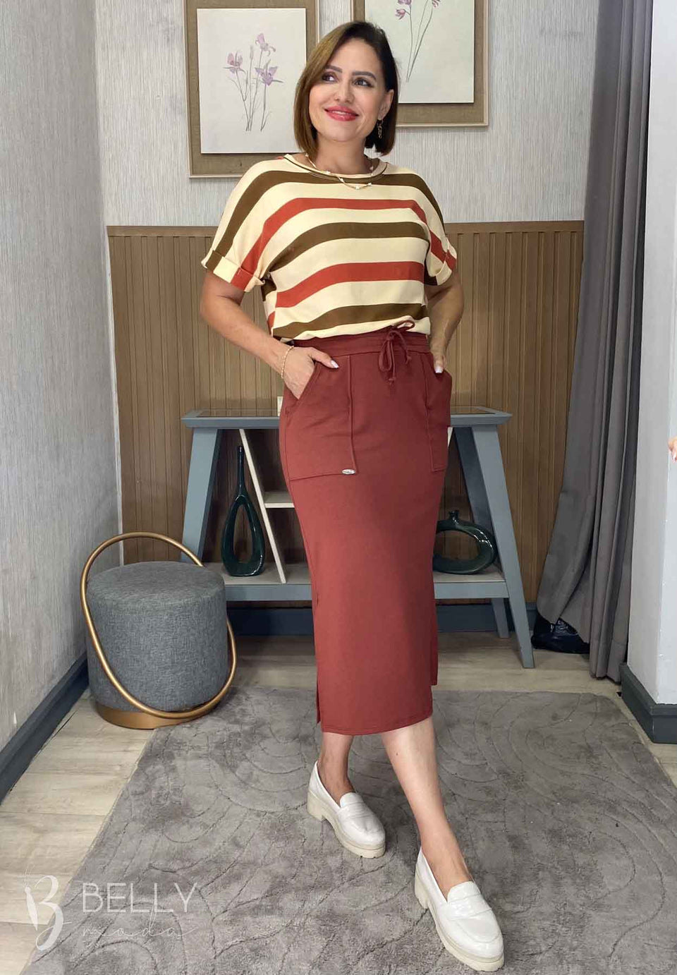 Combine a Saia Helena Midi Fenda - Belly Moda com uma blusa básica para um look casual ou com um body sofisticado para uma produção mais elegante.
