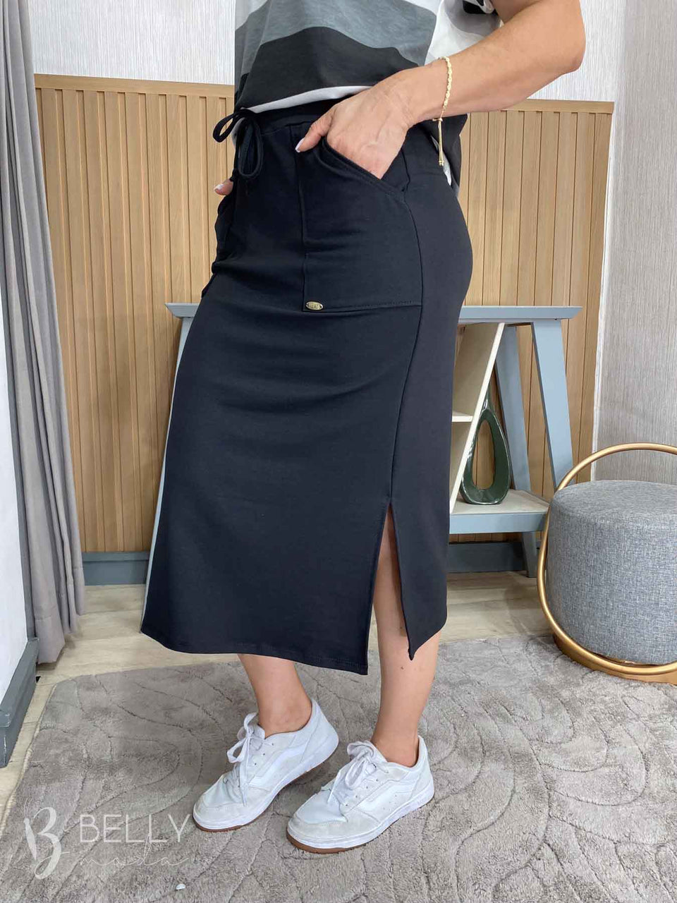 Saia Helena Midi Fenda - Belly Moda é confeccionada em malha moletinho de viscose encorpada, proporcionando um toque macio e suave. Possui cós largo com elástico todo pespontado, bolsos utilitários frontais funcionais e modelagem levemente justa. Seu comprimento é abaixo do joelho, apresentando uma leve fenda lateral.