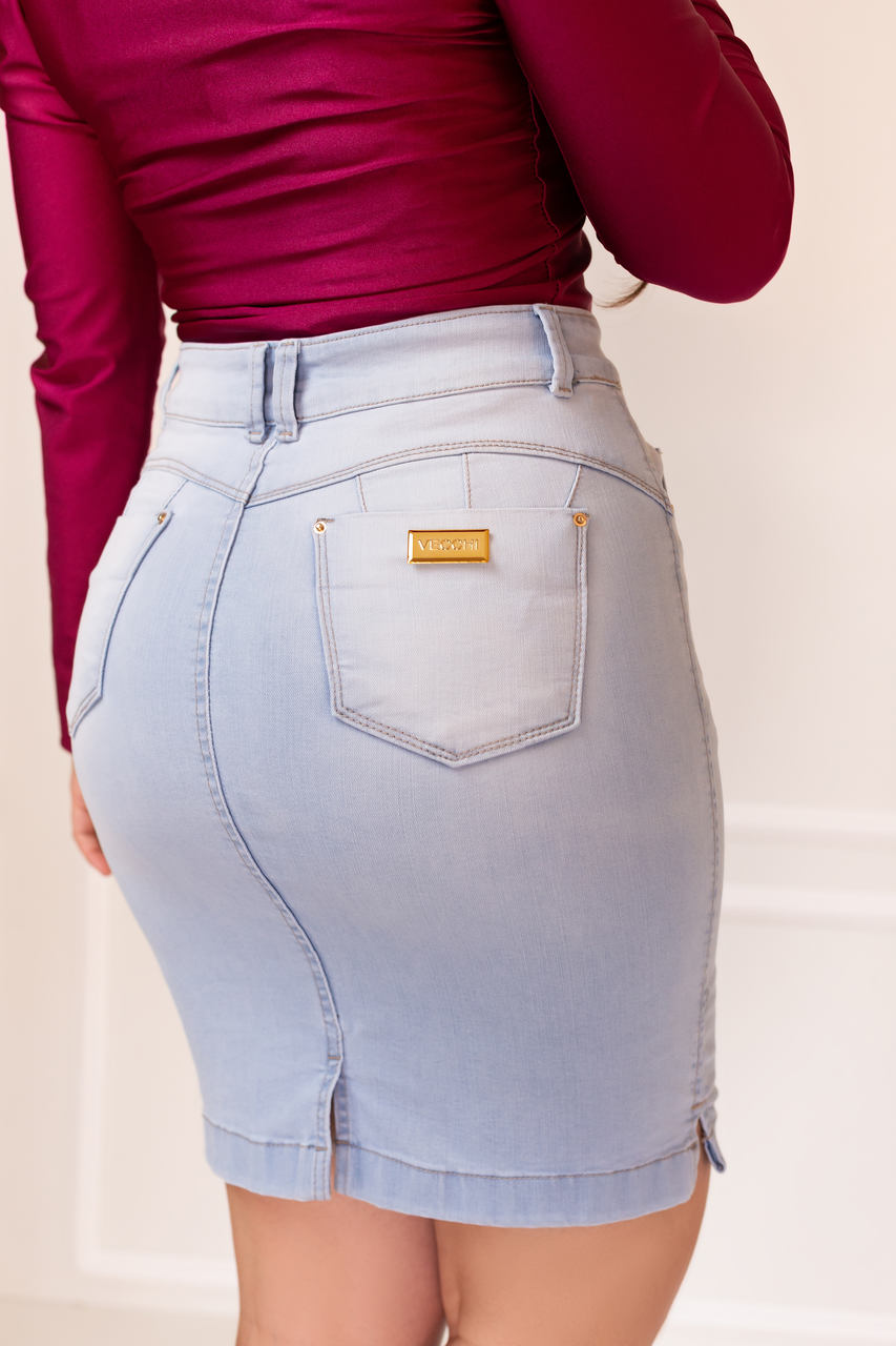 Peça versátil e descolada, a Saia Jeans Claro Vecchi 2311 é confeccionada em jeans de lavagem clara delavê de alta qualidade. Possui modelagem tradicional, aviamentos em dourado e pesponto em cor de linha dourada. Com bolso frontal e traseiro funcionais, comprimento acima do joelho e fechamento em zíper e botões frontal. Destaque para os recortes anatômicos traseiros, que agregam um toque diferenciado à peça.
