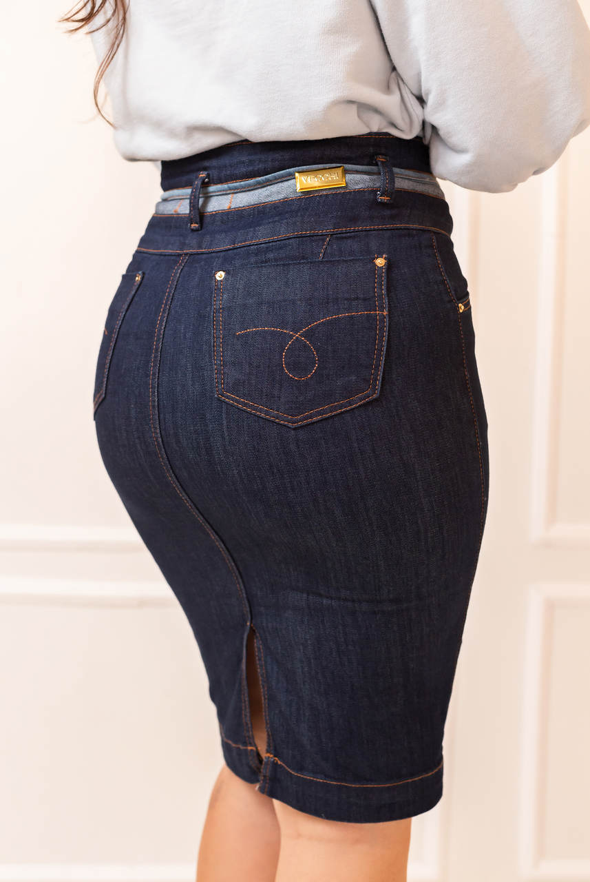 Uma saia jeans clássica e versátil, confeccionada em jeans de alta qualidade com lavagem escura. Possui modelagem tradicional, aviamentos em dourado e pesponto em cor de linha ocre. Com bolsos funcionais na parte frontal e traseira, seu comprimento é na altura do joelho. O fechamento é feito por zíper e botões na parte frontal. Destaque para o cós triplo com detalhe em jeans inverso e cordão no mesmo tecido, que valoriza a silhueta. Ideal para compor looks tradicionais, descontraídos e versáteis.