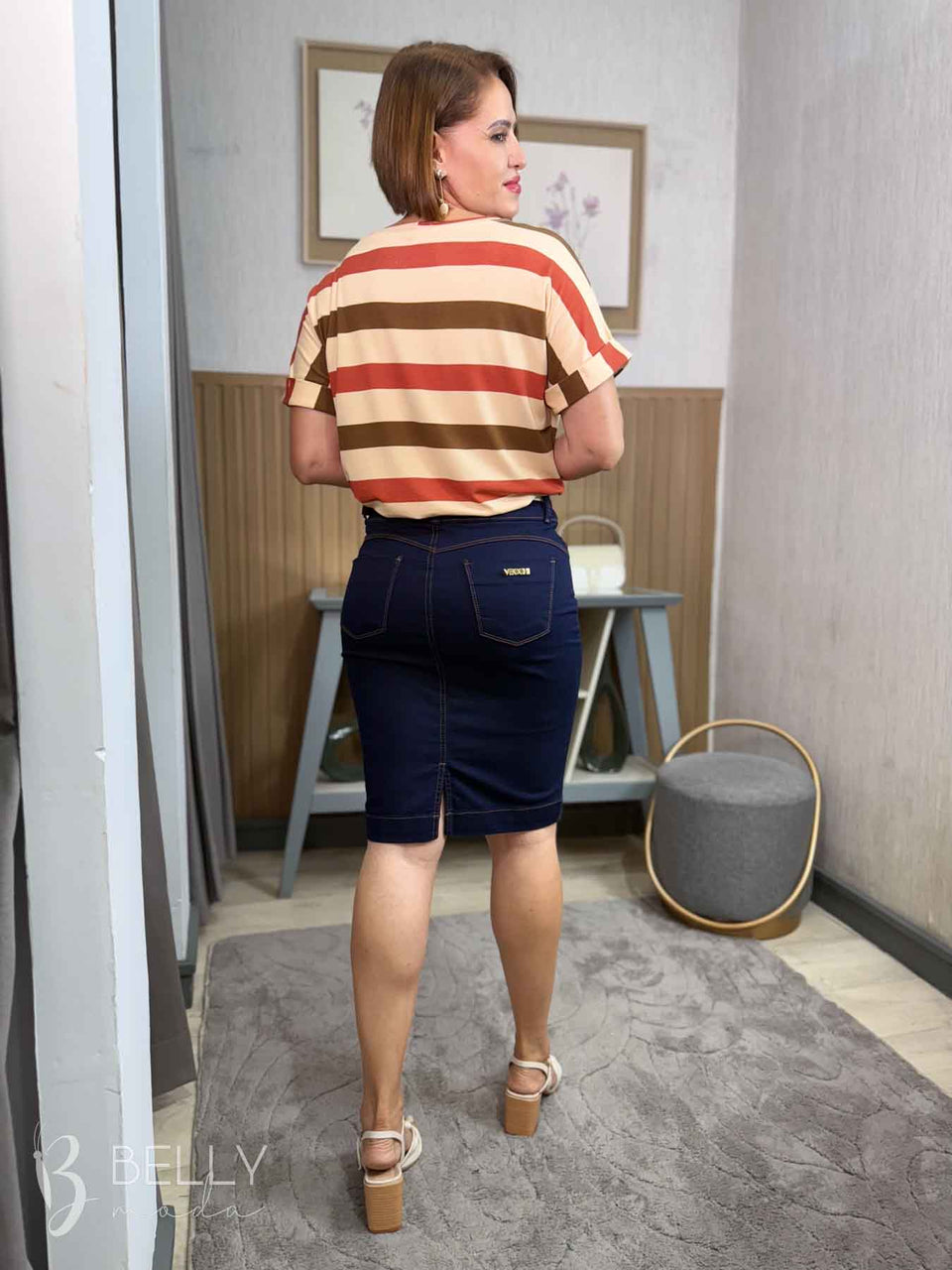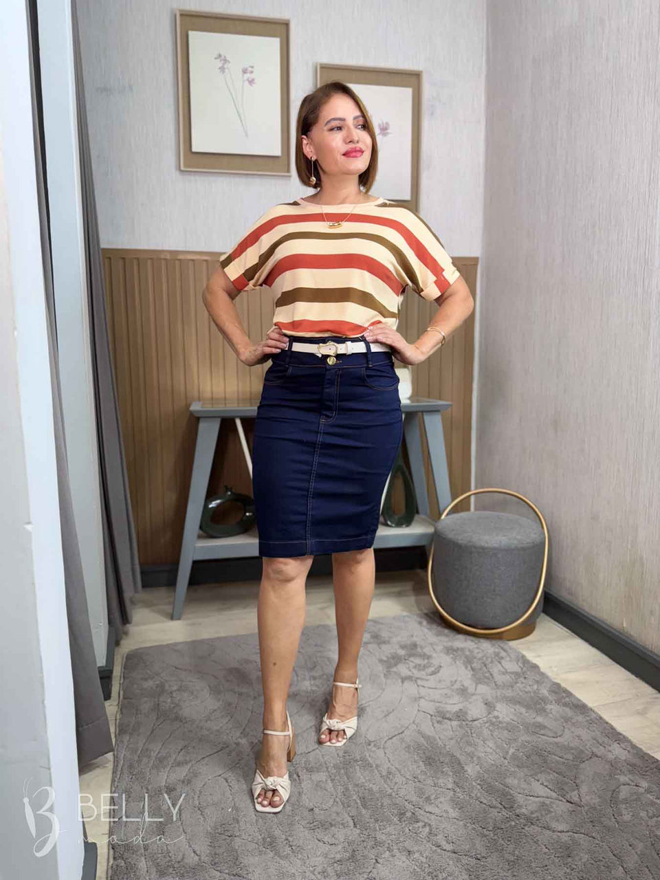 Combine essa saia jeans com uma blusa básica para um look casual ou com uma blusa sofisticada para uma produção mais elegante.