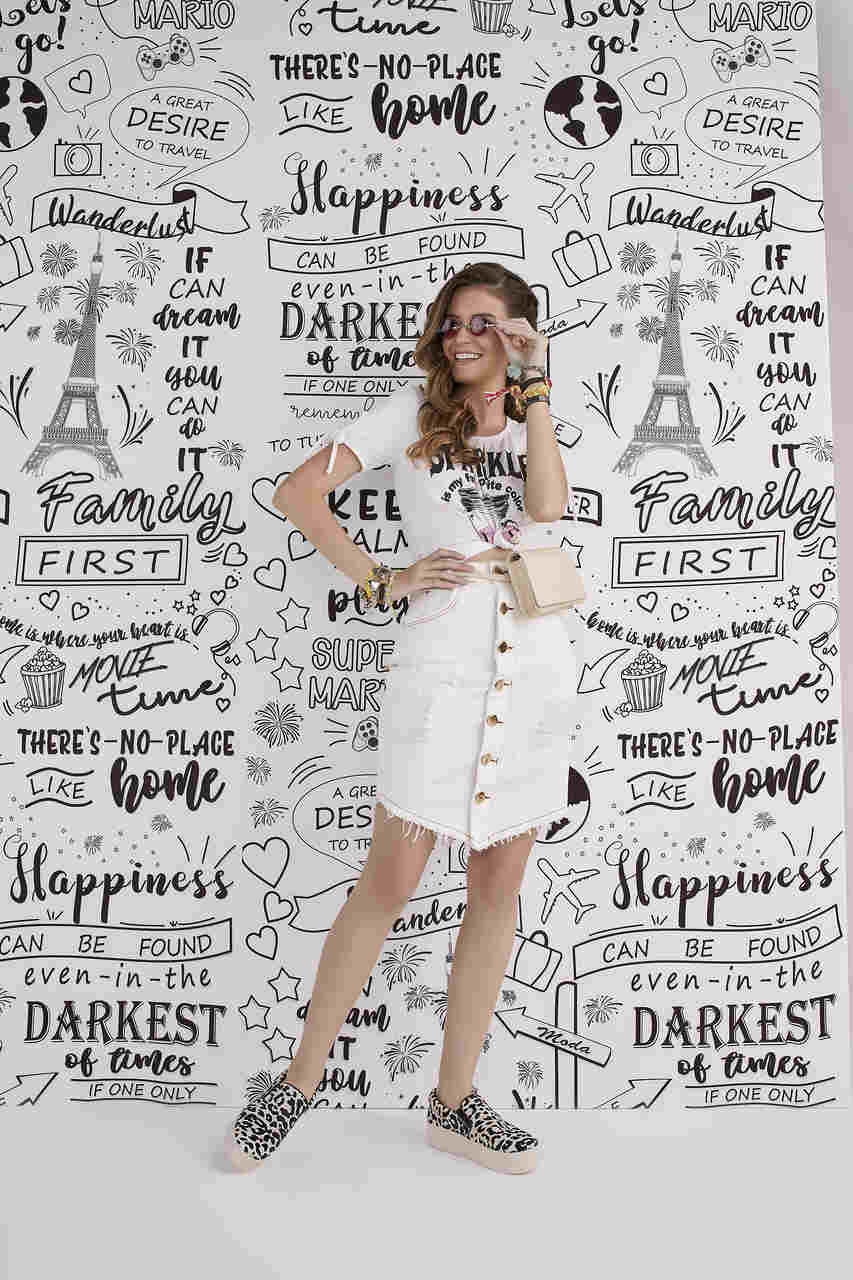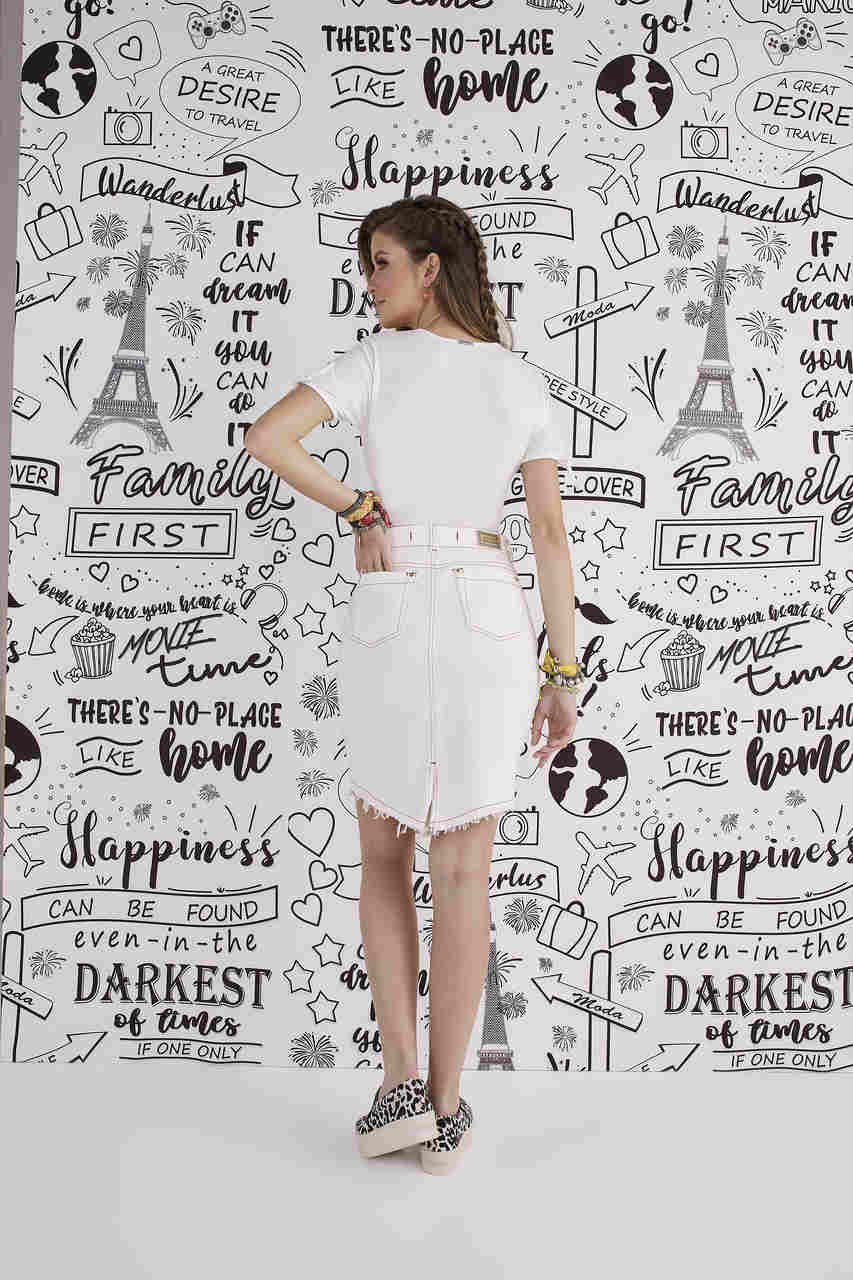Combine a Saia Tradicional Jeans Império com uma blusa básica e tênis para um look casual e cheio de estilo.
