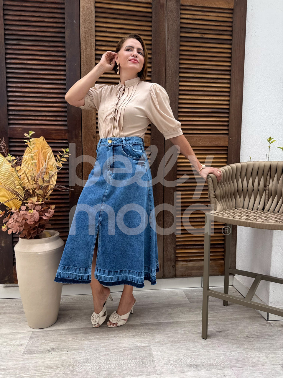Saia Longa Jeans com Fenda Frontal Casual Moderna