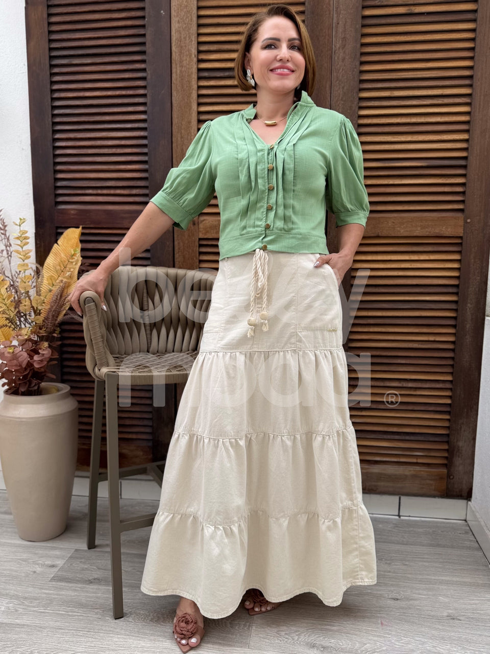 Combine a saia longa em linho com blusas leves ou regatas para um look natural e elegante. Ideal para composições casuais, passeios ou eventos diurnos.