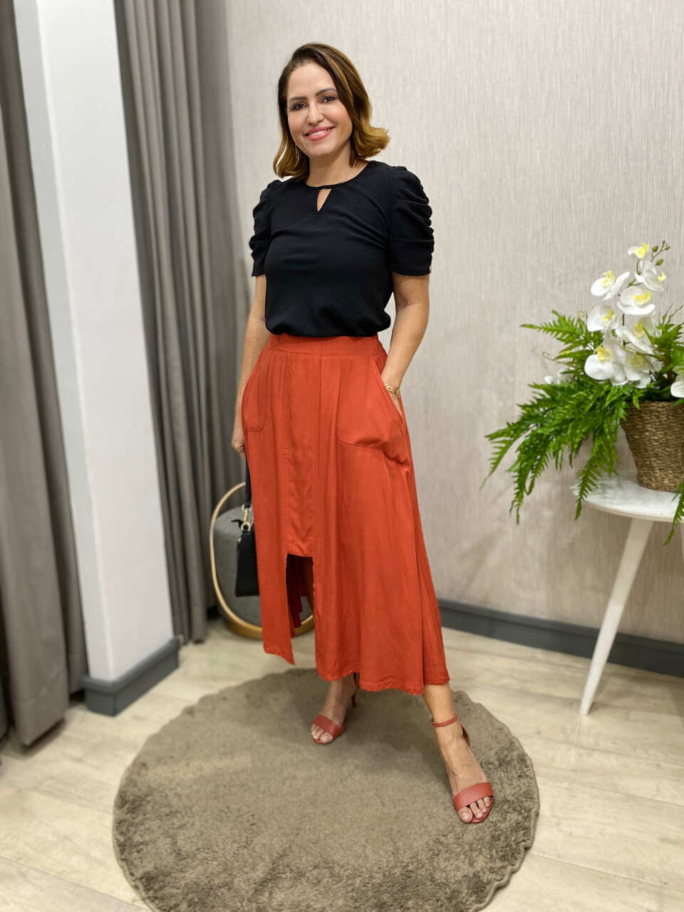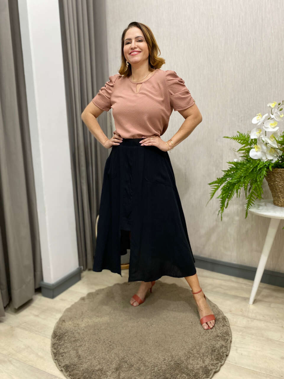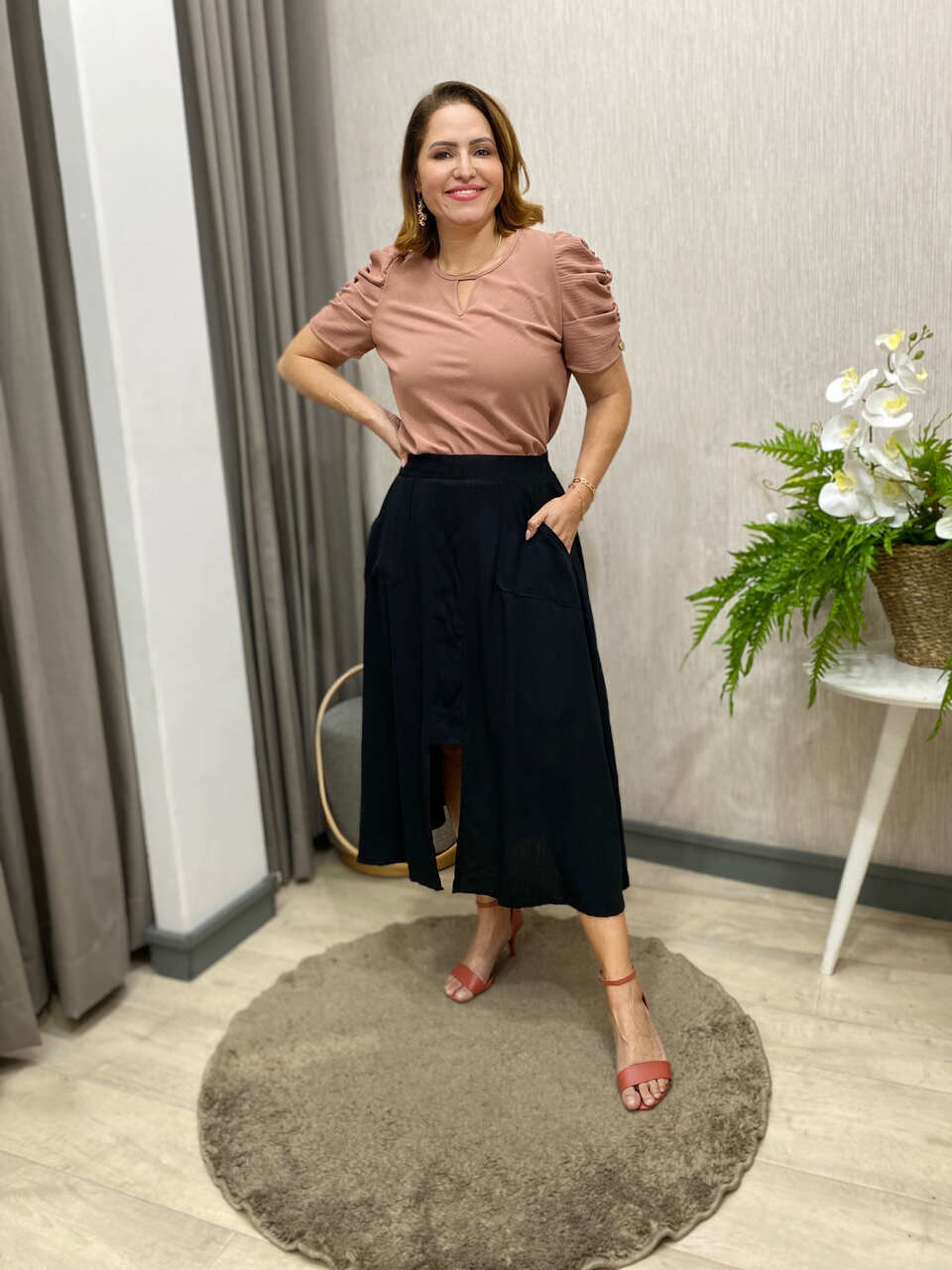 Peça confeccionada em viscolinho, com modelagem godê e recortes frontais que proporcionam uma abertura diferenciada. Possui bolsos laterais, elástico na cintura na parte posterior e é forrada. A saia godê proporciona fluidez e é uma peça versátil que permite a criação de diversos looks.