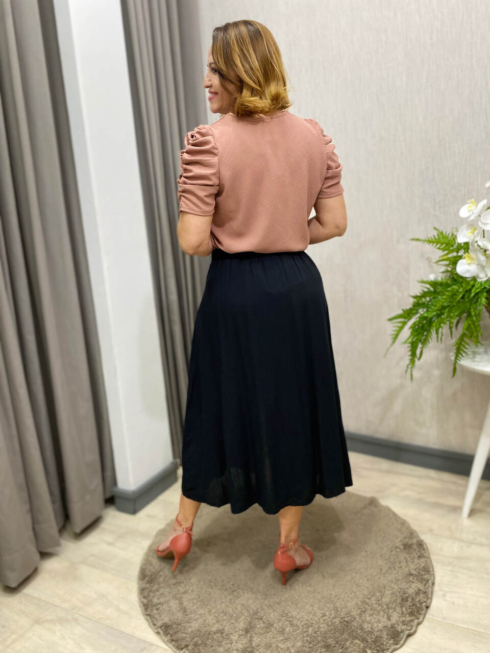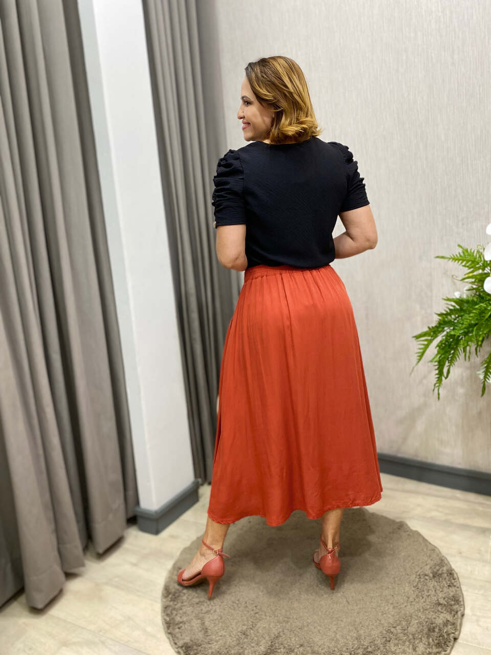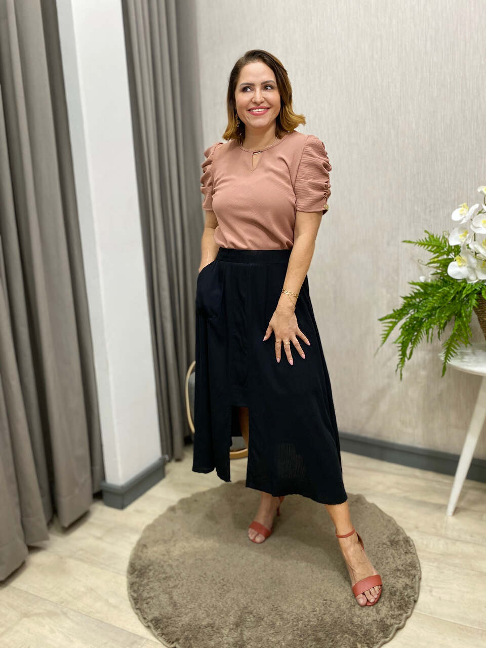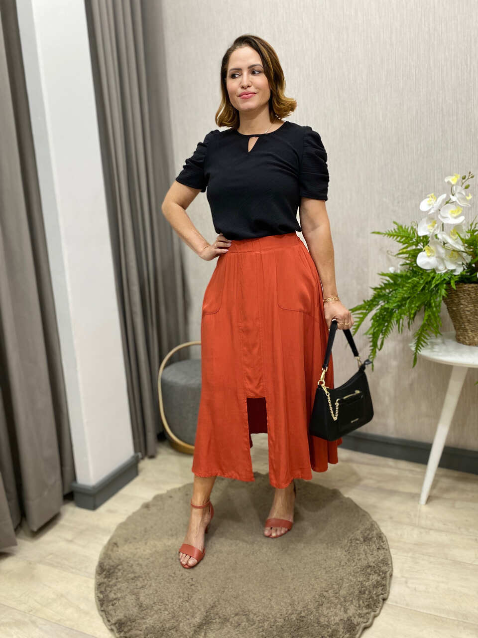 Peça confeccionada em viscolinho, com modelagem godê e recortes frontais que proporcionam uma abertura diferenciada. Possui bolsos laterais, elástico na cintura na parte posterior e é forrada. A saia godê proporciona fluidez e é uma peça versátil que permite a criação de diversos looks.