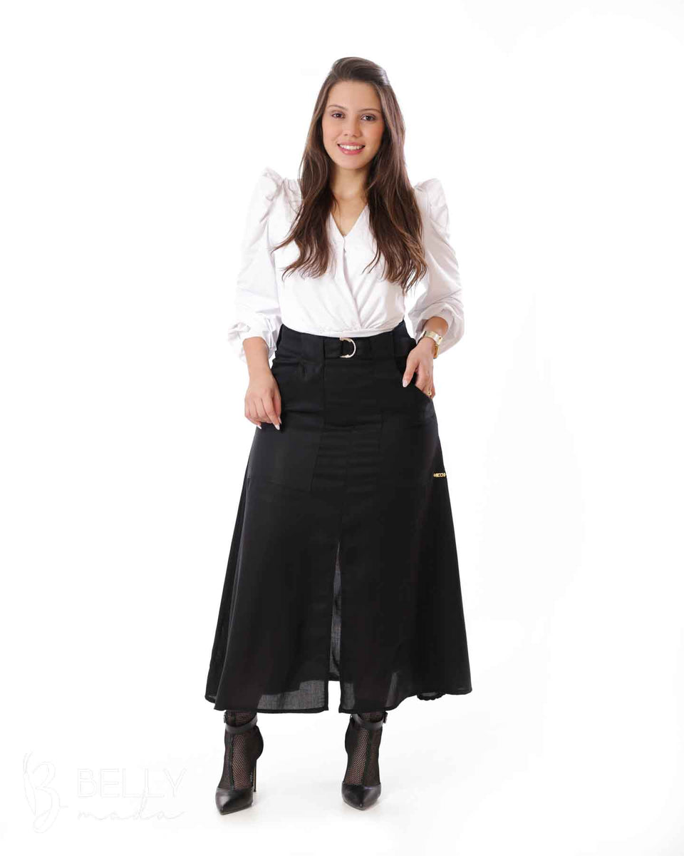Peça elegante e versátil, a Saia Midi Evasê Preto da Vecchi Jeans é confeccionada em tecido plano liocel. Possui bolsos utilitários frontais funcionais, aviamentos em dourado e pesponto em cor de linha preto. Seu comprimento midi acima do joelho traz uma fenda frontal para maior mobilidade. O fechamento em zíper lateral garante praticidade. A modelagem evasê, passantes para cinto e cinto faixa com uma bela fivela adicionam charme e estilo à peça.