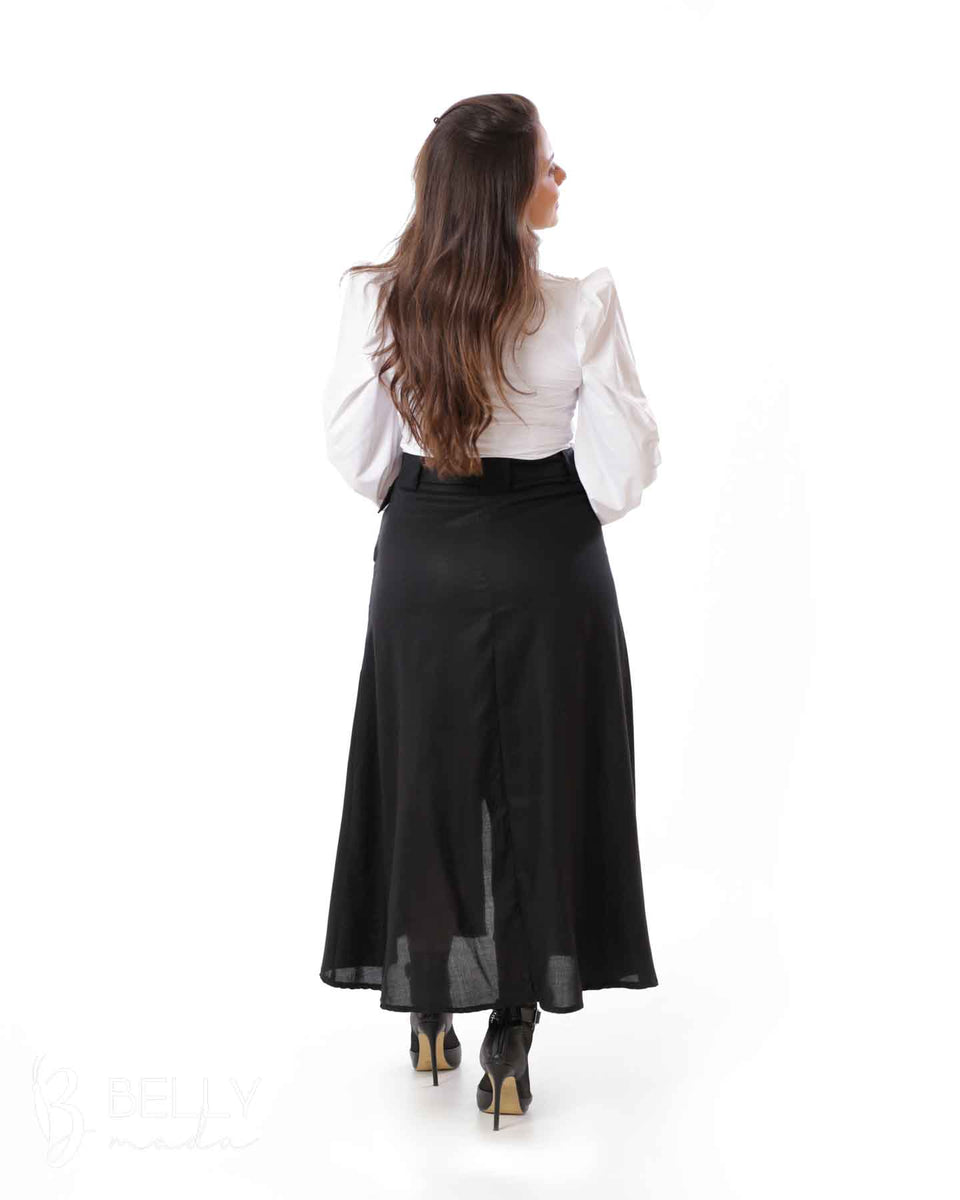 Combine a Saia Midi Evasê Preto da Vecchi Jeans com uma blusa fluída para um look casual chic, ou com uma camisa de tecido mais estruturado para um visual mais sofisticado.