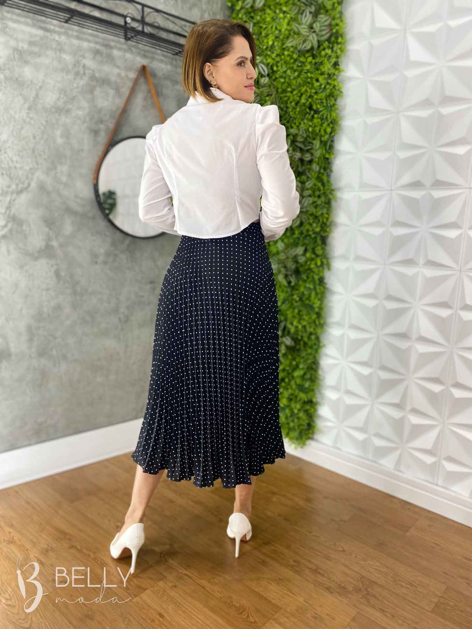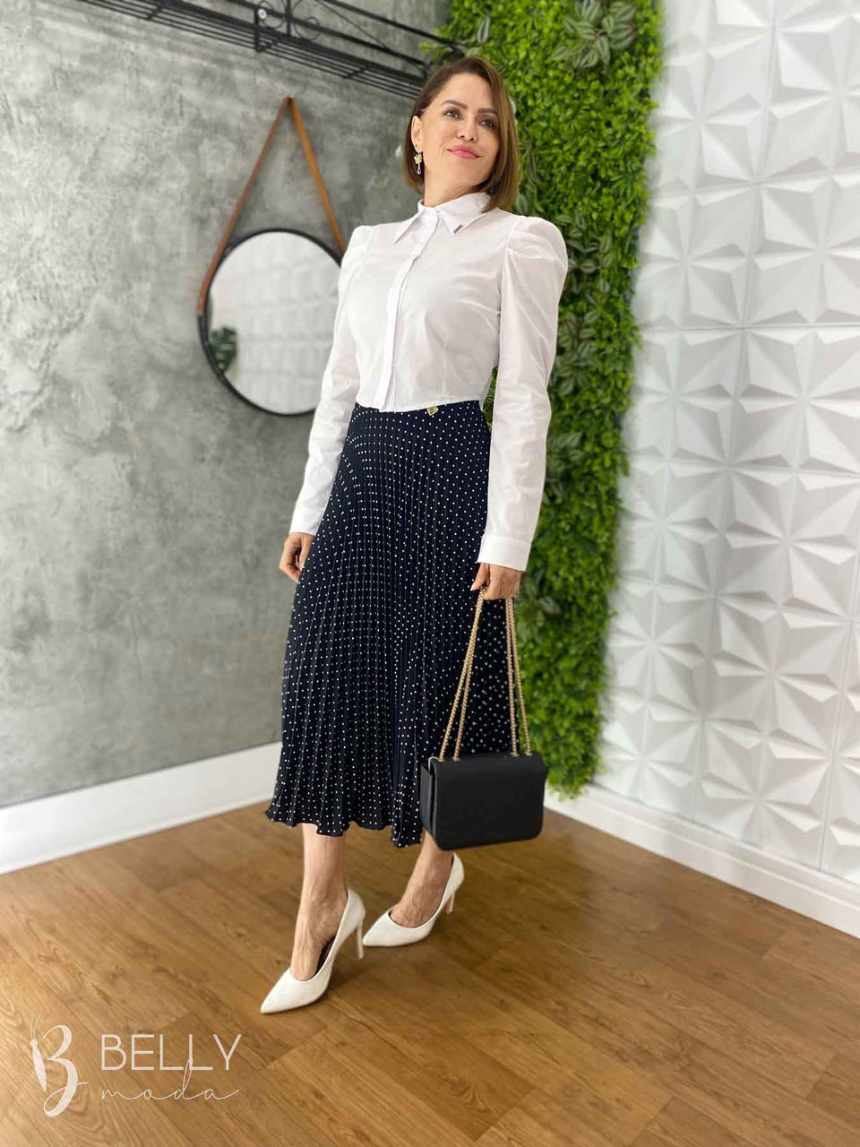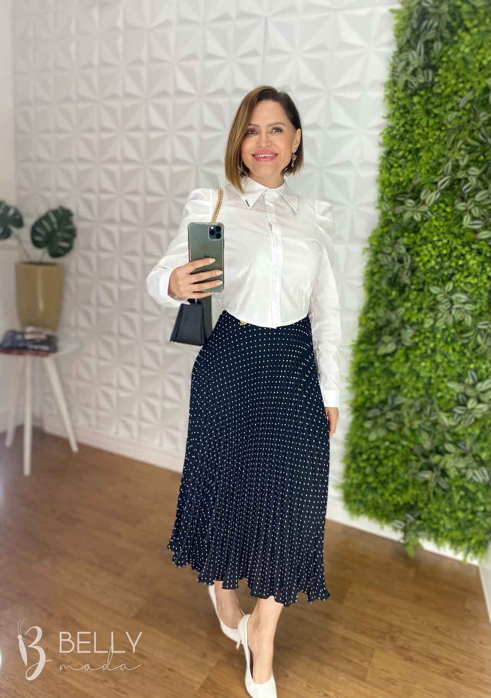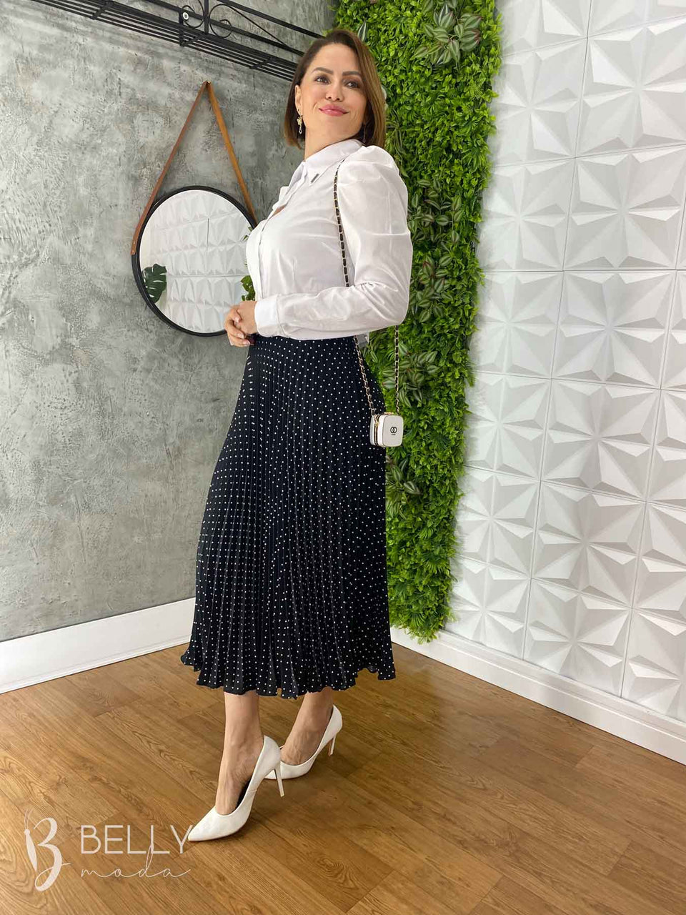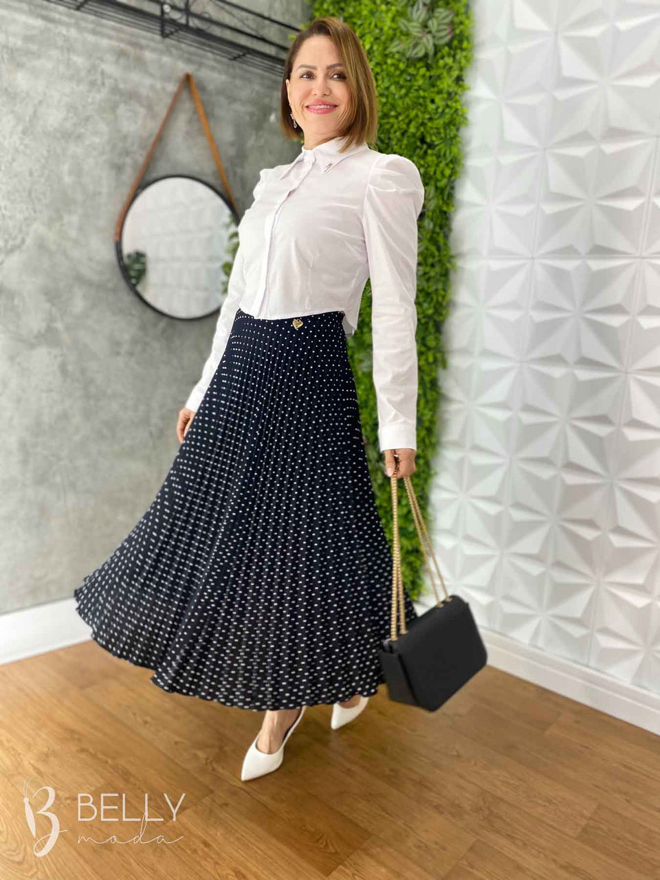 Saia plissada estampada da marca BELLY MODA, confeccionada em crepe de seda, proporcionando um toque macio e suave. A modelagem godê garante bastante fluidez, com um plissado perfeito que dá movimento à peça. Possui comprimento midi, abaixo do joelho, ideal para diversas ocasiões.